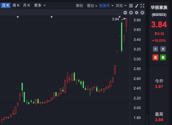 房地产持续回暖 房地产股早间集体走强,板块指数盘初一度放量直线拉升涨近3%。华丽家族(600503)开盘后仅约2分钟就垂直涨停,股价创3年半来新高,近6个交易日5度涨停;栖霞建设(600533)、津投城开、上实发展(600748)等也快速涨停,并均创阶段性新高。