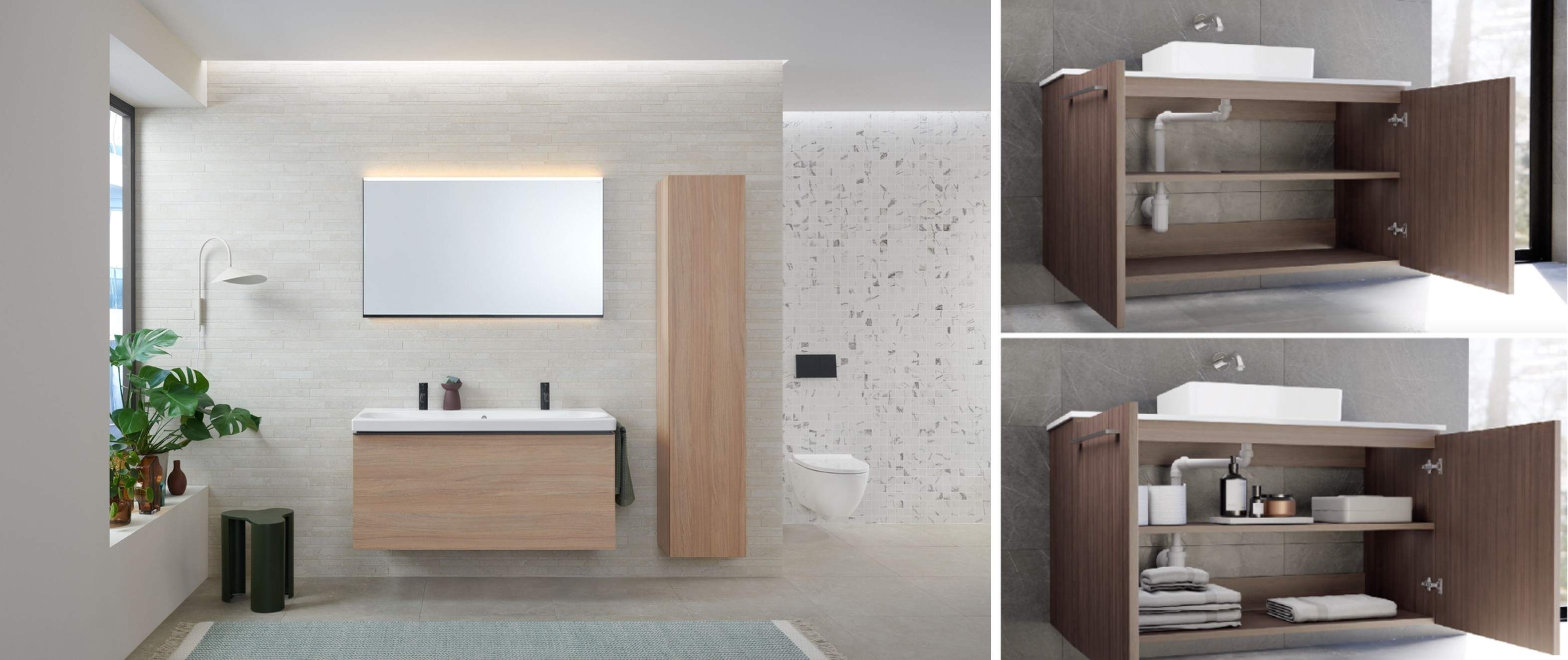 加法,三是收纳加分。吉博力壁挂马桶通过加建墙体嵌入水箱,上方空间可以变成壁龛完整利用;而项目中全面采用吉博力墙排万向存水弯可以释放台盆下的柜内空间,收纳再次上分。