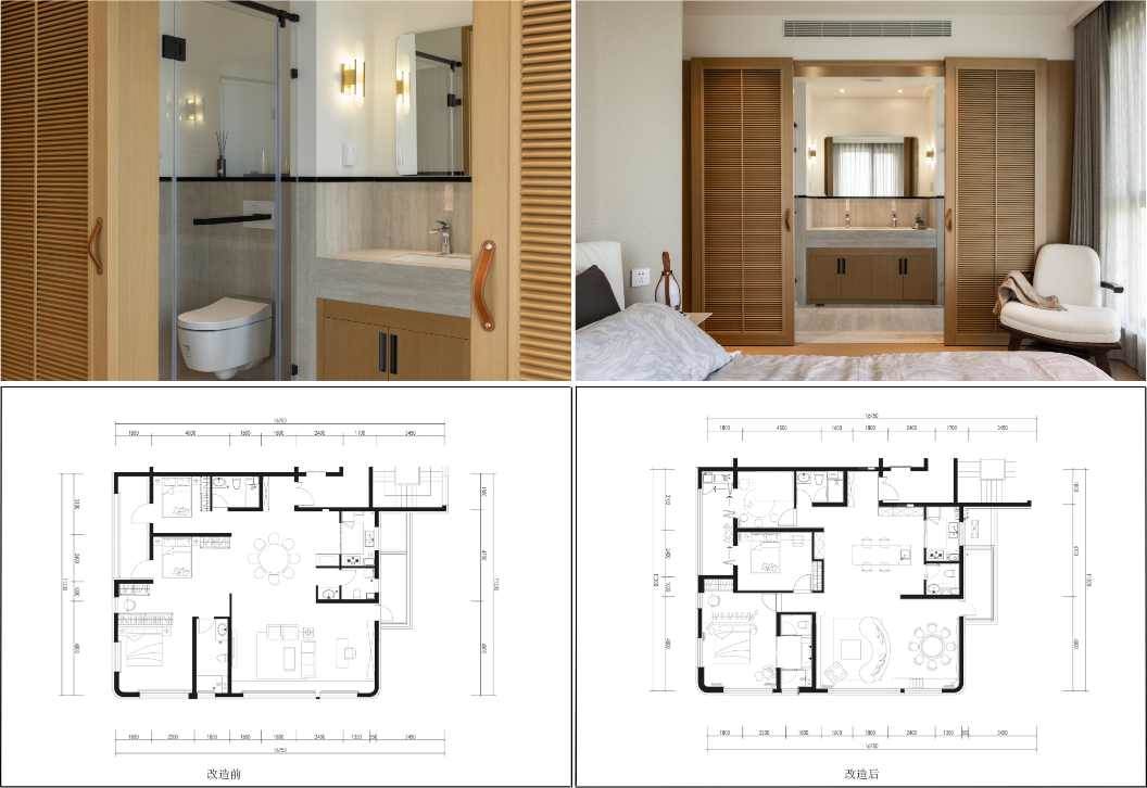 图注:宋玮自宅改造,原南北两卧间卫生间进行三分离后,在朝南主卧新增单独小卫,容纳智能马桶和口袋式洗手盆 加法,二是舒适叠加。卫浴的舒适性主要通过合理布局来满足。以SWA被关注的准豪宅样板房为例,原本三房三卫已经“顶配”,为何开发商仍要“头上安头”再改造? 其实,仅从平面布局就能感受到改造成果——东侧厨卫经过调整后,增容出完整的西厨岛台,下方客卫通过吉博力同层排水技术和壁挂马桶进行90度移位,将外置台盆移入门内,面积利用更高效;而开放式的主卧缺少私密性,SWA将两个卧室彻底分开,主卫纳入主卧独用,再次采用吉博力同层排水技术与壁挂马桶移位,干湿三分离,增加双人台盆符合伴侣同时使用的习惯。