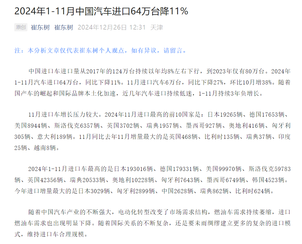每经AI快讯,乘联会秘书长崔东树发文称,中国进口车进口量从2017年的124万台持续以年均8%左右下行,到2023年仅有80万台。2024年1-11月汽车进口64万台,同比下降11%。11月进口汽车6万台,同比下降27%,环比10月增38%。随着国产车的崛起和国际品牌本土化加速,近几年汽车进口持续低迷,1-11月持续3年负增长。