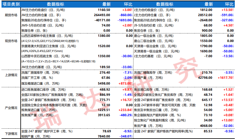 行业消息 1.受春节假期临近等因素影响,部分企业抢抓施工进度,建筑业商务活动指数为53.2%,比上月上升3.5个百分点。从市场需求看,新订单指数为51.4%,今年以来首次升至扩张区间,建筑业企业新签订合同量有所增加。从市场预期看,业务活动预期指数为57.1%,比上月上升1.5个百分点,连续三个月回升,表明建筑业企业对近期行业发展信心有所增强。 2.国家统计局数据显示,12月份,制造业采购经理指数(PMI)为50.1%,比上月下降0.2个百分点,制造业继续保持扩张。非制造业商务活动指数为52.2%,比上月上升2.2个百分点,非制造业景气水平明显回升。综合PMI产出指数为52.2%,比上月上升1.4个百分点,表明我国企业生产经营活动总体扩张加快。 观点总结 焦煤:焦煤市场偏弱运行。近期洗煤厂开工率下降,焦煤供应收缩,不过市场成交平淡,出货压力依然明显,焦煤价格持续弱势,安泽低硫主焦降至1450元/吨,仍有延续下跌趋势,其余品种也有不同程度的下跌。 焦炭第五轮提降落地,焦企利润将有收缩,继续压价采购原料,炉料承压运行。策略建议:JM2505合约探底回升,操作上建议短线维持震荡思路对待,投资者注意风险控制。 焦炭:焦炭市场弱稳运行。全国30家独立焦化厂平均吨焦盈利34元/吨;焦炭五轮提降落地,煤价重心持续下移,焦企预计仍能维持盈利,开工整体弱稳。 港口贸易集港氛围一般,钢厂检修情况增多,铁水产量下行,成材成交疲态。关注钢厂利润变化及成本支撑情况。策略建议: J2505合约冲高回落,成交量明显放大,日MACD指标显示绿色动能柱收窄,操作上建议短线维持震荡思路对待,请投资者注意风险控制。 重点关注 1月1日 洗煤厂开工及精煤原煤库存 |
