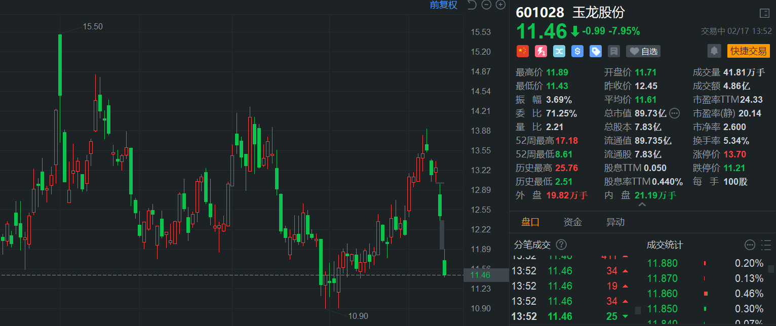 上周五跌超6%的玉龙股份(601028.SH)再度下跌8%,现报11.48元,总市值跌破90亿元。消息上,公司日前公布公告,作为申请执行人参与的案件主要包括与乳山市金硕矿业有限公司的强制执行案件,涉及金额为1.09亿元。此外,公司还面临琴澳联创(珠海)发展有限公司及大横琴(珠海)商贸有限公司的仲裁案件,申请仲裁的金额为4.95亿元。另外,股东海南厚皑科技有限公司拟减持公司股份不超过2349.08万股,减持比例不超过公司总股本的3%。(格隆汇)  |