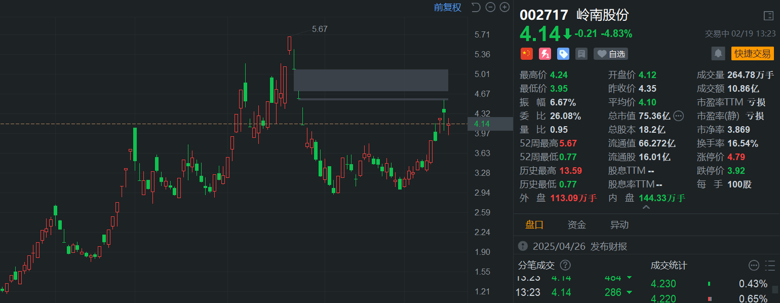 岭南股份(002717.SZ)现跌4.8%报4.14元,盘初一度跌超9%,目前总市值73.4亿元。消息上,昨日龙虎榜数据显示,三家机构买入6777.42万元同时卖出2亿元,净卖出1.33亿元;游资“消闲派”位列卖一席位,净卖出7796.29万元。上榜席位全天买入2.17亿元,卖出4.22亿元,合计净卖出2.05亿元。此外,公司澄清并未与DeepSeek展开合作。(格隆汇)