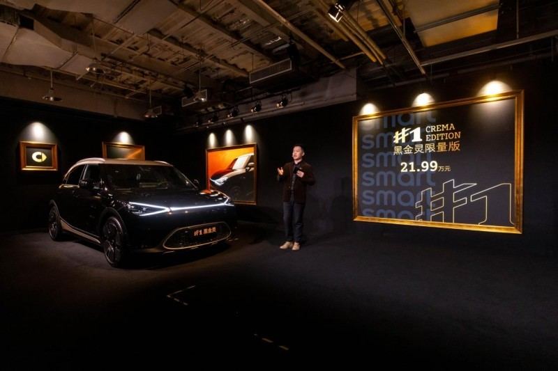 自2022年推出首款纯电动车型smart精灵#1以来,smart品牌不仅迅速扩大了其产品阵列,还通过不断推出限量版和特别版车型,成功确立了“紧凑级豪华纯电SUV领先者”的市场地位。此次推出的#1 黑金灵限量版,不仅提升了产品的豪华感和个性化,为用户带来了更高品质的非凡体验,也进一步巩固了smart品牌在豪华纯电市场中的差异化竞争优势。 从产品价值的角度来看,smart #1 黑金灵限量版在设计、配置和用户体验等方面均实现了全方位升级。在外观设计上,新车采用了“沉寂黑+日冕金”经典黑金双拼色车身设计,营造出百万级豪车迈巴赫同款的腔调。黑镶金隐藏式门把手、日冕金配色车身装饰等专属视觉元素细节、CREMA EDITION专属徽标,无不彰显出新车的高端定位和独特气质。