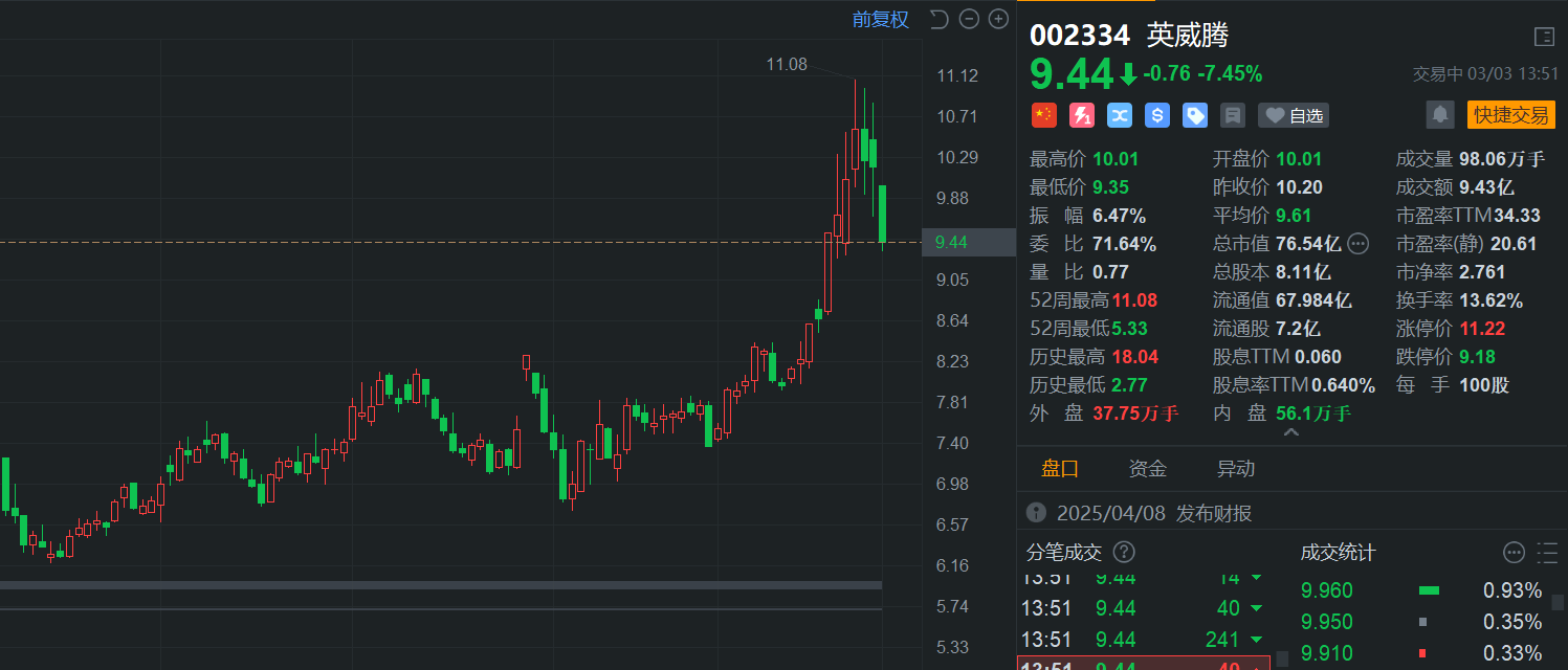 英威腾(002334.SZ)现跌7.45%报9.44元,并且录得连续3日回撤,总市值76.5亿元。消息上,英威腾日前发布业绩快报,公司2024年1-12月实现营业收入43.22亿元,同比下降5.84%;归属于上市公司股东的净利润2.83亿元,同比下降23.86%。报告期内,由于市场竞争加剧,光伏储能及新能源汽车等板块的收入下降约2.68亿元,导致毛利额减少。(格隆汇)