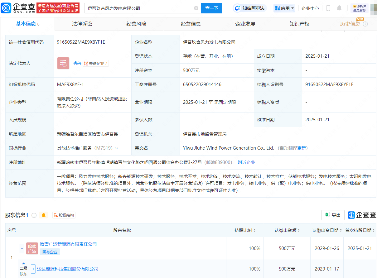 企查查APP显示,近日,伊吾玖合风力发电有限公司成立,法定代表人为毛兴,注册资本为500万元,经营范围包含:风力发电技术服务;新兴能源技术研发;储能技术服务;发电技术服务;太阳能发电技术服务等。企查查股权穿透显示,该公司由运达股份(300772)间接全资持股。
