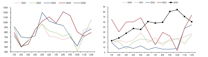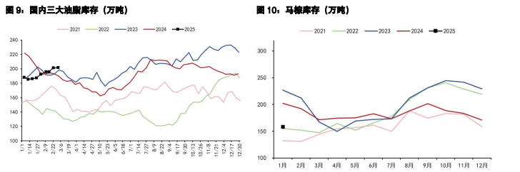 【豆粕】 【重要资讯】 特朗普拟对中国额外征收关税引发美豆出口下降预期,美豆走弱,中期种植面积下降预期予以支撑。周一国内豆粕现货涨 50 元,华东报 3640 元/吨左右。周一油厂开机率 45.43%,成交13.25 万吨,提货15.54万吨。上周国内豆粕库存增加,大豆库存下降,同比均处于中等分位,后续主要关注3 月到港衔接是否顺畅。 南美方面,巴西升贴水近期因内陆物流、海运费上涨而偏强震荡,大豆到港成本稳定为主,未来两周雨量未超出季节性,后续收割受影响不大。阿根廷未来一周预计仍有较大规模降雨。特朗普于上周四称拟于 3 月 4 日对中国额外征收 10%关税,关注关税具体落实情况。 【交易策略】 美豆因种植面积下调平衡表转好等存在较强支撑,升贴水方面关注巴西大豆上市是否形成二次卖压,到港成本暂弱稳看待。此外美国贸易政策仍然施压,国内反制预期会施压美豆,但此种情景会引发南美升贴水上涨,为国内豆系提供支撑。 国内豆粕现货因预期 2、3 月到港较少形成库存偏紧预期,现货博弈激烈。远月豆粕在贸易战与美豆种植面积未定背景下可能会呈现有强支撑的格局,单边尝试回落后买入。此外,也需注意贸易战中期通常会给经济带来伤害,当豆粕价格过高时,抑制下游消费,以2018、2019年的经验来看,因榨利较高、需求回落引发的豆粕高位回落行情也较明显。 【油脂】 【重要资讯】 1、据船运调查机构 ITS 及 AmSpec,2 月前 10 日马棕出口环比下降 3.94%或增加6.39%,2月前15日出口环比下降 13.34%-19.9%,2 月前 20 日出口环比下降 0.3%-8.1%,前 25 日出口环比(-2.7%,1.2%),2月整体出口环比下降 8.5%-11%。2 月前 10 日产量下滑 1.81%,2 月前15 日产量环增12.54%,2月1-20日马来西亚棕榈油产量增加 8.57%或下降 5.78%。 2、美国农业部将于 3 月 31 日发布的《预期种植报告》将成为下个月最受关注的报道。 3、据 Mysteel 调研显示,截至 2025 年 2 月 28 日,全国重点地区棕榈油商业库存41.46 万吨,环比上周减少 1.57 万吨,减幅 3.65%;全国重点地区豆油商业库存 94.15 万吨,环比上周增加1.27 万吨,增幅1.37%。 国内现货基差稳定。广州 24 度棕榈油基差 05+800(0)元/吨,江苏一级豆油基差05+480(0)元/吨,华东菜油基差 05+30(0)元/吨。 【交易策略】 油脂因棕榈油产地供应仍处低位、销区前期进口较少近期有可能恢复采购而近月合约偏强的逻辑已经兑现,高价油脂已经抑制了印度、巴西等地的需求,油脂或进入震荡趋势。中期则受新作油脂恢复性增产及美国生物柴油需求总量削减的疑虑影响偏空。