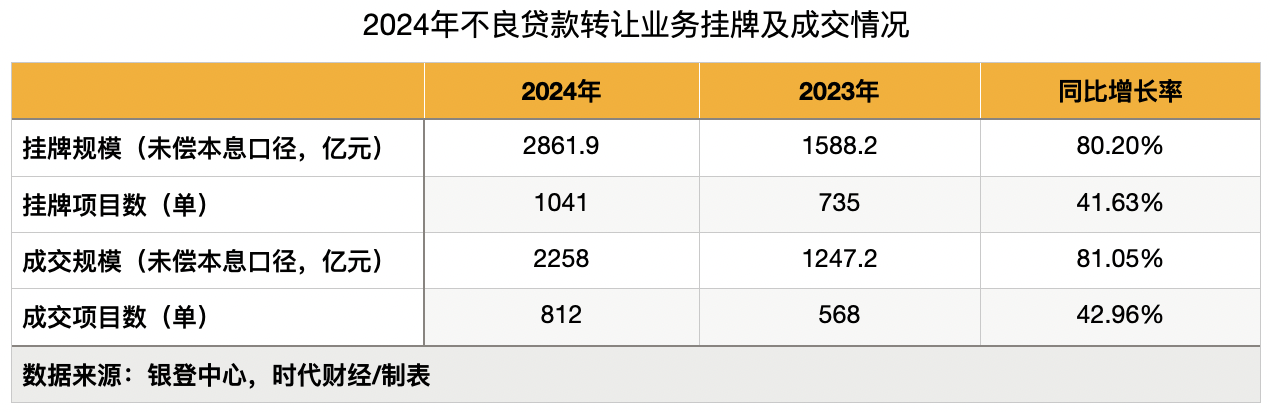 图片来源:银登中心官网 同日,北京银行(601169)信用卡中心发布2024年第2期个人不良贷款(信用卡透支)转让项目,债权金额共1.60亿元,预计竞价时间为2025年3~4月。 面对日益上升的资产质量压力,银行业正在加速“甩包袱”,多家银行集中在银登中心的不良资产转让板块出售不良资产。据时代财经不完全统计,2月以来,已有数十家银行机构在银登中心的转让平台密集转让不良资产,其中不仅包括邮储银行、交通银行、平安银行(000001)、建设银行等全国性银行,也包括北京银行、河北银行等城商行以及甘肃、贵州等地的农商行。 从处置的不良贷款类别来看,除对公不良贷款项目外,多家银行挂出的不良资产包均涉及个人房贷项目、个人消费贷、信用卡等。从转让价格来看,也不乏有银行以不到1折的“骨折价”进行甩卖。 不良资产包打折转让 北京银行在上述不良资产转让项目招商公告中介绍,该不良资产包的债权金额共1.60亿元,其中本金1.06亿元,利息5437.16万元,共计对应7717户债务人。 北京银行还称,该债权资产项目的几大亮点包括,区域集中度高,债务人所属区域集中在济南、南京和青岛地区;户均本金1.37万元左右,债务人偿还压力可控、催收难度低;加权平均年龄42.23岁,其中30~50岁债务人数量占比达77%,还款潜力高;未诉客户达7364户,占比超95%,便于多元化诉调结合。 值得关注的是,在银登中心刊登的众多转让项目中,多家银行将不良资产以“打骨折”的方式进行甩卖,甚至以低于1折的价格出手转让。 河北银行2月末发布的《2025年第一期不良资产收益权转让结果公告》显示,该行资产原始金额达2.41亿元的个人住房抵押贷款不良资产包,最后的实际转让金额仅为7300万元,这相对于原始金额打了约3折;另据广发银行2月底发布的《关于璟粹2025年第三期不良资产收益权转让结果公告》,该行的个人信用卡贷款不良资产包,资产原始金额为19.66亿元,最终实际转让金额仅为1.47亿元,相当于不到1折。 有银行业内人士向时代财经指出,“以低价挂牌出售的不良资产大部分是经过多次催收仍无法回收的债项,回收率通常很低、催收难度较大,因此定价有所打折比较常见。” 在银登中心的不良贷款转让平台,部分银行挂出的不良资产包逾期已久。据中原银行郑州分行近日挂出的一笔不良资产项目,该行未偿还本息总额达1.92亿元的不良贷款(个人经营性贷款)包,加权平均逾期天数已达到1687天。 3月3日,北京市隆安(广州)律师事务所郑霜杰律师在接受时代财经采访时表示,不良资产的转让定价机制主要考量回收预期、处置成本、市场波动、政策导向等多个因素。“如对于有抵押物的个贷不良资产,房地产抵押物可能因当地房地产市场低迷、难以在短期内以合理价格出售从而导致处置周期延长。再加上较高的法律诉讼成本,这为金融机构带来沉重的负担,也影响了不良资产包的折扣定价。” 据银登中心1月10日发布的《2024年四季度不良贷款转让业务统计》(下称“《报告》”)数据显示,截至2024年4季度末,个人不良贷款批量转让、对公不良资产批量转让的平均折扣率分别为4.8%、18.6%(统计口径为未尝本息总额)。 个人不良贷款成转让大头 近年来,在宏观经济增速放缓的大背景之下,地方债务、房地产、个人贷款逾期等重点领域均处于风险释放期。面对日益上升的资产质量压力,银行加快处置不良资产以释放资本空间,不良贷款转让市场随之出现快速扩张,转让及成交规模均创下新高。 上述《报告》数据显示,从挂牌情况来看,2024年全年,不良贷款转让业务的未偿本息规模合计达2861.9亿元,较2023年的1588.2亿元同比增长80.2%;挂牌项目数为1041单,较2023年的735单同比增长41.63%。 从实际成交结果来看,2024年全年,成交的不良贷款未偿本息金额合计为2258亿元,较2023年的1247.2亿元同比增长81.05%;成交项目单数为812单,较2023年的568单同比增长42.96%。