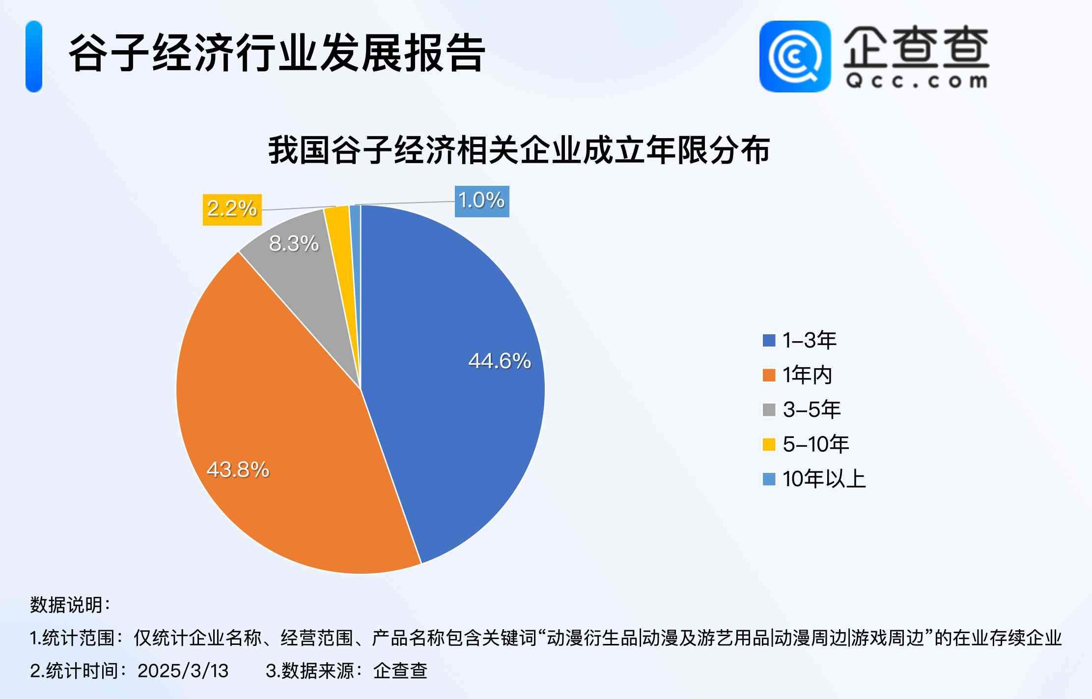 在今年两会上,“谷子经济”成为热点话题,多位两会代表委员建言推动其发展。包括建议广州加大政策引导,培养相关人才,打造完整产业链;提议对“谷子经济”给予政策优惠、资金扶持等。当前该经济形态处于发展初期,虽存在产能不足等问题,但在政策助力与市场需求推动下,未来有望通过创新产品、完善产业链等,持续释放消费活力,成长为文化消费领域的重要力量。 有机构数据显示,2023年中国“谷子经济”市场规模已超1200亿元。未来数年“谷子经济”将呈持续增长态势,预计2029年整体市场规模将超过3000亿元。 企查查数据显示,近十年,我国谷子经济相关企业每年注册量呈现逐年增加的趋势,截至3月13日,2025年我国已注册47万家谷子经济相关企业。企业存量方面,我国现存634.7万家谷子经济相关企业,其中成立于近三年的企业占比超88%,行业分布上集中归属批发和零售业,占比超86%。 1.从注册量来看:今年已注册47万家