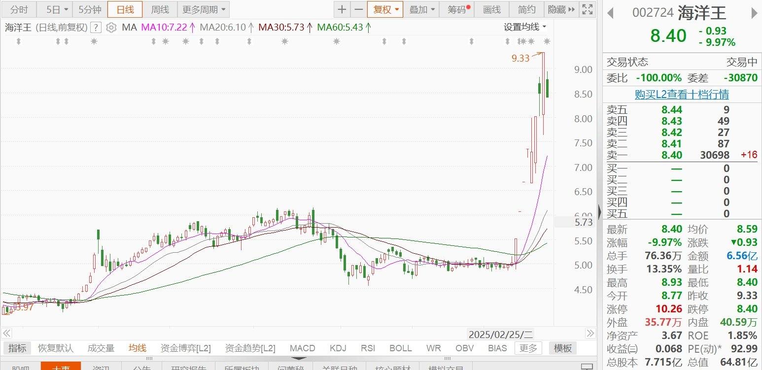 此前8天6板涨停的海洋王(002724.SZ)今日跌停,报8.4元,总市值64.81亿元。海洋王公告称,公司注意到“深海科技”相关概念受市场关注较大,公司就此郑重声明如下:部分媒体将公司纳入“深海科技”概念股。经核实,公司目前无“深海科技”相关业务和产品,与“深海科技”概念无关。公司现有主营业务和财务数据亦无关联。经公司董事会全面核查,公司过往所有公告、定期报告中均未提及“深海科技”、“深海概念”等相关表述。此类传闻与公司实际情况完全不符,系对投资者的严重误导。  |
