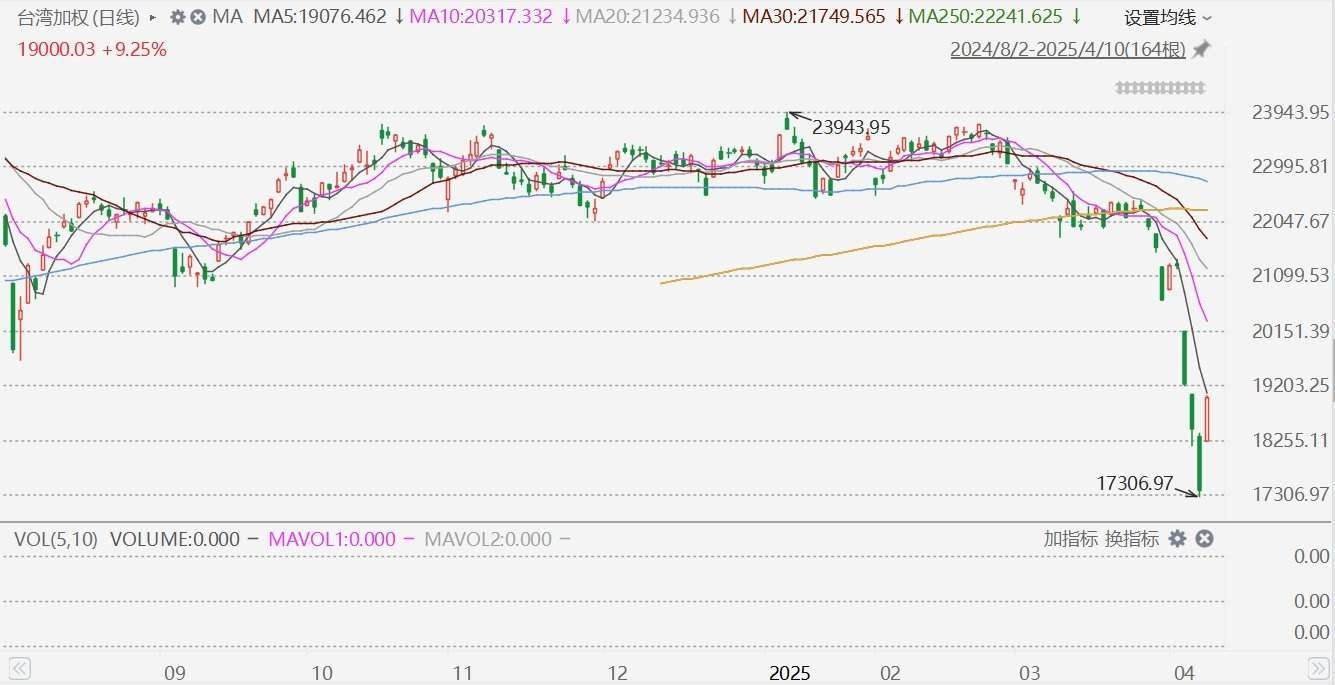 美国贸易政策出现缓和迹象,台股暴涨。台湾加权指数今日收涨9.25%,报19000.03点。台积电、鸿海、联发科、台达电、广达、长荣、纬颖、华硕、大立光等全部封死涨停板。