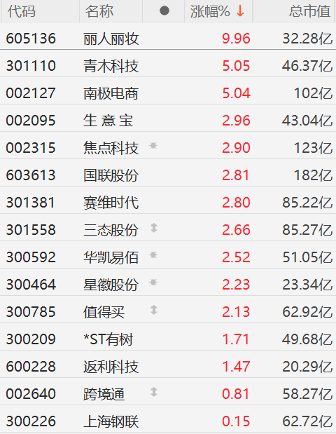 A股市场互联网电商概念股集体拉升,其中,丽人丽妆涨停,青木科技、南极电商涨超5%,生意宝、焦点科技、赛维时代、三态股份、值得买等跟涨。