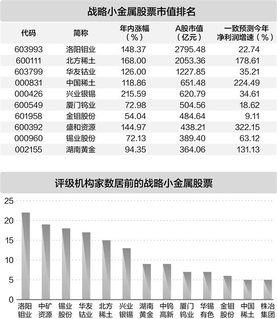 证券时报记者 陈见南 近期,部分小金属品种价格出现大涨。其中金属钴价格已超35万元/吨,较去年底翻倍;钨价格方面,江西钨精矿(65%)最新达到26.6万元/吨,年内累计涨幅接近翻倍,9月份更是创出历史新高;钼价格也有所异动,河南钼精矿(45%)最新达到4380元/吨,年内累计涨幅超过21%;另外沪锡2511合约年内累计上涨超过10%。 小金属价格此番涨势迅猛,背后有着复杂且多元的原因。从全球供需格局来看,随着科技的飞速发展,新能源、电子信息、航空航天等新兴产业蓬勃兴起,对小金属的需求呈井喷式增长。例如,金属钴在锂电池制造中不可或缺,而新能源汽车产业的爆发式发展使得锂电池的需求大增,进而推动了钴价上涨。同时,部分小金属的全球储量有限,且产地较为集中,供应端一旦出现风吹草动,如主要产区的政治局势不稳定、矿山生产受限等,都会对价格产生巨大影响。 中国银河证券研报指出,战略小金属的“类避险”价值有望迎来重估。该机构认为,传统的避险资产是贵金属,主要基于“稀缺”+“信用中性”+“共识”,而小金属亦具备“稀缺”的自然属性以及不可替代战略用途的“共识”,且定价上相对货币中性,因此可视为“类避险”资产。 哪些A股是战略小金属龙头股?从市值角度来看,洛阳钼业最新A股市值超过2700亿元,公司2025年上半年钴营收高达57.28亿元,钨钼营收超40亿元。 北方稀土作为稀土行业的代表,总市值超2053亿元,市值规模保持稀土行业首位,2025年上半年公司营收近189亿元,同比大增超45%;净利润超9.3亿元,同比大增近20倍。 华友钴业是钴镍双料龙头,最新市值近1228亿元。2025年上半年公司钴产品出货量2.08万吨,同比下降9.89%;镍产品出货量13.94万吨,同比增长83.91%。 兴业银锡9家骨干子公司现保有资源量超5亿吨,其中银金属量3.06万吨、锡金属量39.9万吨。公司子公司银漫矿业2024年锡金属产量8902吨,为国内排名第二大锡精矿生产商。 厦门钨业拥有完整的钨产业链,在钨矿开采、钨冶炼、钨粉末、钨丝材和硬质合金深加工领域拥有较为突出的竞争优势。 从股价表现来看,这些战略小金属龙头股年内平均涨幅超过90%,远超大盘及有色指数同期表现。其中,兴业银锡、北方稀土、华钰矿业、洛阳钼业等12只个股涨幅均超过100%,章源钨业、湖南黄金、东方锆业等11股涨幅在50%至100%。随着金属价格的上涨,部分个股未来业绩也值得期待。根据机构一致预测,盛和资源、中国稀土、广晟有色等个股今年净利润均有望翻倍增长。 (本版数据由证券时报中心数据库提供) |