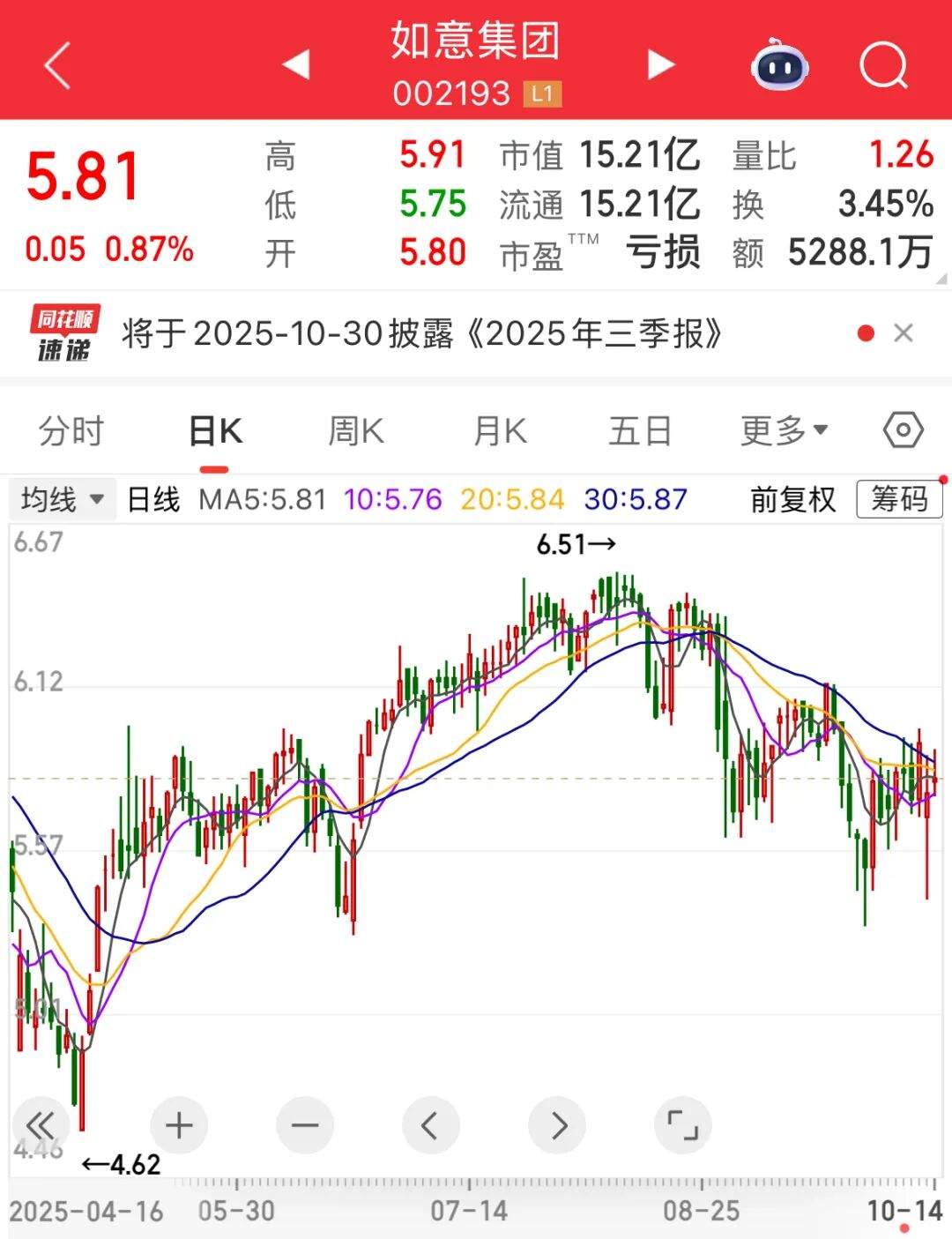 如意集团最新收盘价5.81元/股,总市值规模15.21亿元。截至2025年9月30日,公司股东户数为2.56万人。公司2025年上半年营业收入约1.54亿元,同比减少32.25%;归母净利润亏损约9573万元。