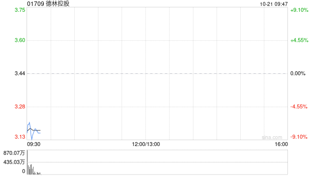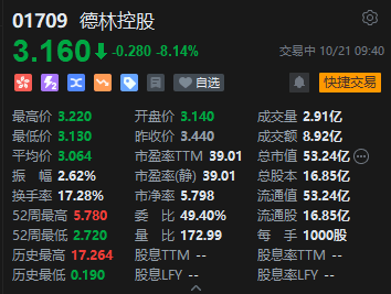 10月21日消息,德林控股盘中一度跌超9%,现跌8.14%,报价3.16港元。