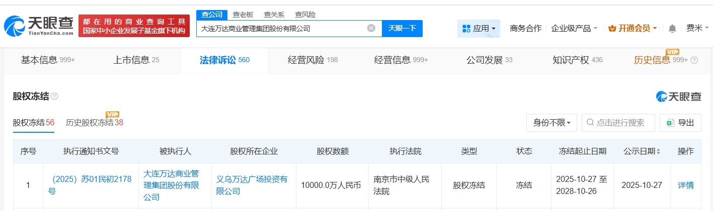 天眼查天眼风险信息显示,近日,大连万达商业管理集团股份有限公司新增一则股权冻结信息,股权所在企业为义乌万达广场投资有限公司,冻结股权数额1亿人民币,冻结期限为三年,执行法院为南京市中级人民法院。 大连万达商业管理集团股份有限公司成立于2002年9月,法定代表人为张春远,注册资本约271.6亿人民币,经营范围包括建设工程设计、代理记账、商业综合体管理服务等。股东信息显示,该公司由大连万达集团股份有限公司、王健林等共同持股。