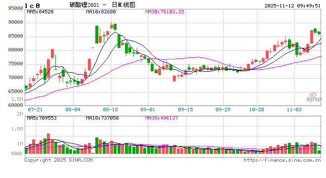 来源:华泰期货 作者: 王育武 市场分析 2025-11-11,碳酸锂主力合约2601开于87700元/吨,收于86540元/吨,当日收盘价较昨日结算价变化1.38%。当日成交量为902490手,持仓量为526493手,前一交易日持仓量534483手,根据SMM现货报价,目前基差为-4800元/吨(电碳均价-期货)。当日碳酸锂仓单28099手,较上个交易日变化608手。 碳酸锂现货:根据SMM数据,电池级碳酸锂报价80600-84000元/吨,较前一交易日变化1550元/吨,工业级碳酸锂报价79600-80600元/吨,较前一交易日变化1550元/吨。6%锂精矿价格1013美元/吨,较前一日变化18美元/吨。据SMM数据,市场情绪高涨,下游材料厂持谨慎观望态度,仅维持刚需采购,市场成交以后点价为主。目前,上下游企业正在就明年的长期协议进行谈判,现阶段主要围绕系数展开博弈。供应端来看,锂盐厂整体开工率保持高位运行,其中锂辉石端与盐湖端开工率均维持在60%以上,成为供应主力。预计11月国内碳酸锂产量可以维持10月的生产量级,环比大致持平。需求方面,动力市场新能源汽车商用乘用同时快速增长;储能市场供需两旺,供应持续偏紧。 赣锋锂业公告称,阿根廷萨尔塔省矿业和能源秘书处已为PPGS锂盐湖项目一期颁发了《环境影响评估报告》,标志着该项目取得关键进展。PPGS锂盐湖项目计划于2026年上半年向阿根廷政府提交大型招商引资制度(RIGI)申请。根据技术报告,整合后的PPGS锂盐湖项目拥有约1,507万吨LCE探明+控制资源量,将成为最大的未开发锂卤水资源之一。PPGS锂盐湖项目采用赣锋锂业(002460)直接提锂工艺与太阳能(000591)蒸发池技术,旨在提高生产效率、减少淡水消耗。 策略 当天期货盘面高位震荡,库存持续去化,消费端支撑较好,但价格上涨后,现货成交转淡,下游对高价接受程度相对有限。矿端复产正在推进中,预计后续逐步复产。需关注消费与库存拐点,若消费转弱,矿端复产,库存或从去库转为累库,届时盘面或回落。 单边:短期观望为主,关注库存与消费拐点及矿端复产情况,择机逢高卖出套保 跨期:无 跨品种:无 期现:无 期权:无 风险 1、 消费端持续超预期, 2、 矿端扰动超预期, 3、 宏观情绪及持仓变动影响。 投资咨询业务资格: 证监许可【2011】1289号 免责声明: 本报告基于本公司认为可靠的、已公开的信息编制,但本公司对该等信息的准确性及完整性不作任何保证。本报 告所载的意见、结论及预测仅反映报告发布当日的观点和判断。在不同时期,本公司可能会发出与本报告所载意 见、评估及预测不一致的研究报告。本公司不保证本报告所含信息保持在最新状态。本公司对本报告所含信息可 在不发出通知的情形下做出修改, 投资者应当自行关注相应的更新或修改。 本公司力求报告内容客观、公正,但本报告所载的观点、结论和建议仅供参考,投资者并不能依靠本报告以取代 行使独立判断。对投资者依据或者使用本报告所造成的一切后果,本公司及作者均不承担任何法律责任。 本报告版权仅为本公司所有。未经本公司书面许可,任何机构或个人不得以翻版、复制、发表、引用或再次分发 他人等任何形式侵犯本公司版权。如征得本公司同意进行引用、刊发的,需在允许的范围内使用,并注明出处为 “华泰期货研究院”,且不得对本报告进行任何有悖原意的引用、删节和修改。本公司保留追究相关责任的权利。 所有本报告中使用的商标、服务标记及标记均为本公司的商标、服务标记及标记。 华泰期货有限公司版权所有并保留一切权利。 |