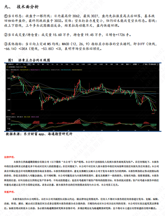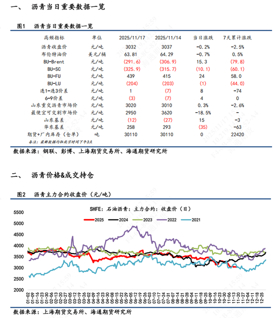 日报观点 【1】盘面表现:BU主力2601盘内拉升后快速回落,振幅1.16%,最终收于3032元/吨,跌幅0.16%,近7天累计跌幅2.5%。次月合约2602跌幅0.16%,合约期限结构呈现近低远高的Contango结构,结构相对有所扁平。 【2】现货市场:①山东重交沥青市场价为3020元/吨,环比上涨0.3%,7天累计跌幅2.6%。山东基差为-12元/吨,7天累计跌幅3元/吨,基差季节性回落。②华东重交沥青市场价为3290元/吨,升水期货。华东基差为258元/吨,7天累计涨幅-63元/吨,累涨放缓。 【3】裂解变化:①BU-Brent录得-292元/吨,7天累计跌幅95元/吨。目前来看,BU跌势有所放缓,裂解差再大幅走弱的可能性会减弱。当日BU主力跌幅0.2%;Brent跌幅0.7%(以下午3点收盘成交价计算)。②当日BU-SC(-10)/BU-LU(+24)/BU-FU(-1)继续回跌,BU-SC跌幅最多。 【4】基本面变化:供应端,主力炼厂将间歇停产,产量存在缩减预期;需求端,天气逐渐进入寒冷,南北需求相对平淡,下游需求开工率不高,对高价货接货意愿不高,市场观望情绪浓厚。库存端,社会库存同期高位,处于被动去库,供应压力渐在。成本端,成本支撑减弱,沥青在能化板块中表现相对弱势。整体沥青基本面平淡,无过多亮点。关注冬储行情变化。 【5】短期展望:基本面上,价格依旧弱势看待,自身上行空间仍受制于需求减弱和库存压力两方面影响,关注冬储行情是否起色。年底前OPEC+增产冲击油价重心,沥青大概率跟跌重心下移。技术面上,沥青价格底部震荡,往下走的空间有限,预期弱势震荡。 【6】策略:①单边空2601合约可适当止盈;②卖2601合约认沽期权。③空BU-Brent裂解差逢低止盈