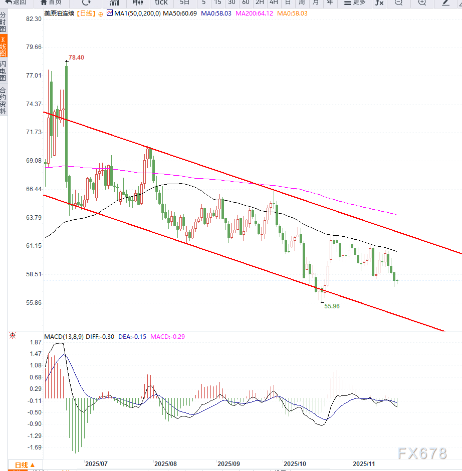 价格在57.60—58.20美元区间反复获得支撑,显示买盘存在一定承接,但若该区域被有效跌破,短线恐将向56美元一线延伸。而若油价能够重新站上59.80美元上方并实现有效收盘,则有机会触发技术性反弹,进一步挑战61美元附近的密集压力带。