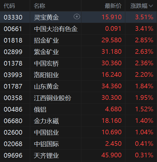 富拓外汇平台:受美联储降息希望提振,港股有色金属股普涨,灵宝黄金涨3.5%,招金矿业、紫金矿业涨近3%,中国宏桥、洛阳钼业涨超2%