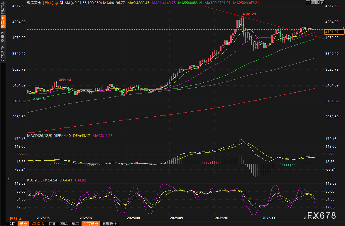 周二(12月9日)亚市早盘,现货黄金窄幅震荡,目前交投于4192美元/盎司附近。周一现货黄金价格小幅回落,每盎司收报4190.48美元,下跌0.2%,而美国期金结算价则下跌0.6%至每盎司4217.7美元,市场在美联储政策会议前夕的短暂喘息,投资者们正屏息以待美联储主席鲍威尔的最新表态,同时地缘政治紧张局势、美元波动以及突发事件如日本地震,都在悄然影响着黄金的走势。总体而言,尽管短期内金价承压,但基本面支撑强劲,央行持续购金和避险需求将继续推动黄金向上突破,专家甚至预测到2026年第一季度,金价有望触及每盎司5000美元的里程碑。