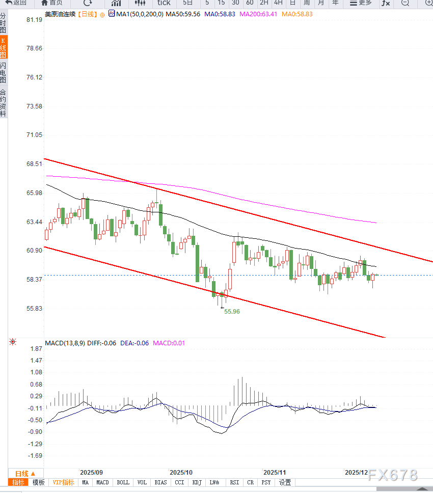 从技术走势观察,WTI价格继续在58—60美元区间窄幅震荡,K线形态显示多头力量有限。价格多次在60美元附近遇阻,而下方58美元形成阶段支撑,短期呈现弱势横盘形态。