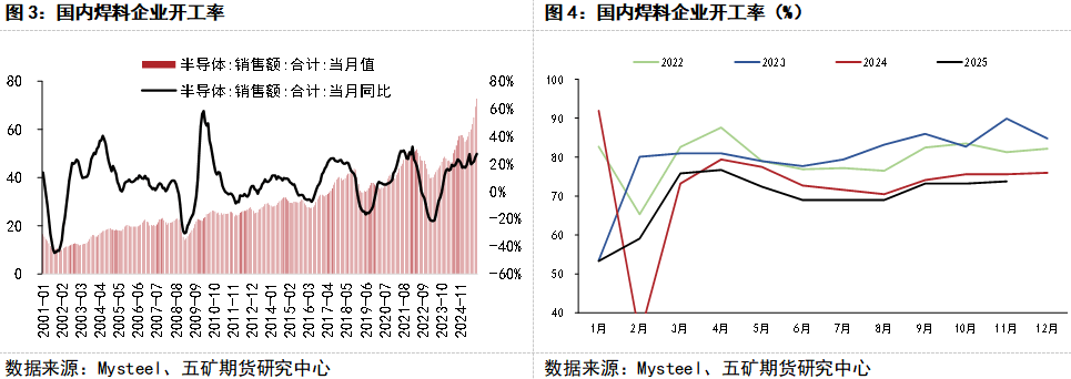 需求端:消费电子整体低迷,AI算力景气持续 需求方面,半导体行业延续景气,国内锡焊料企业开工率呈现维稳态势。11月份样本企业锡焊料产量环比增加0.95%,开工率较10月份小幅上涨0.69%。 分地区来看,华南地区的锡焊料厂商整体展现出更强韧性,开工水平大体维持稳定。原因在于,当地产业链更深度嵌入新能源汽车、AI服务器等新兴应用领域,这些下游板块的订单相对充足且预期向好,为生产端带来了较为持续的支撑与成长空间。此外,华南聚集了数量众多、体量不大但业务链条较完整的灵活型企业,在应对短期需求变化时调整节奏更快,能够更好对冲市场波动的不利影响。与之形成对比的是,华东地区的锡焊料企业开工情况受压更为明显。该区域的客户结构更偏向传统的消费电子与家电板块,而在11月份,这些传统行业订单恢复节奏偏慢,“旺季不旺”的格局凸显,导致整体交易情绪偏弱,开工积极性也随之下降。 展望12月,全国范围内锡焊料企业的开工率预计略有回落,光伏焊带相关订单则进入以去库存为主的阶段。由于光伏组件企业在年末面临排产重新规划以及资金回笼考核的双重压力,往往会主动压缩包括焊带在内的原材料库存规模,以降低资金占用,从而在短期内削弱对新增焊料的采购需求。与此同时,临近财年收官,部分上市公司会调整经营重心,由追求业务规模转为更加看重利润兑现与现金回流,在采购原材料时趋于保守和精打细算,这也在一定程度上压缩了上游焊料厂商的订单量。
