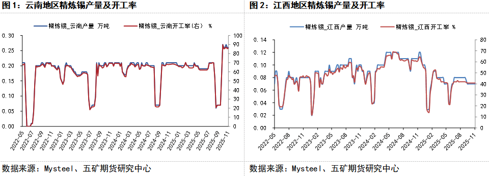 供给端:10月锡矿进口有所回升,矿端紧缺略有改善 根据海关公布数据,2025年10月国内锡矿进口量有所回升,10月份国内锡矿进口量为1.16万吨(折合约5050金属吨)环比33.49%,同比-22.54%,较9月份上涨1482金属吨(9月份折合3568金属吨)。1-10月累计进口量为10.3万吨,累计同比-26.23%。10月份国内锡锭进口量为526吨,环比-58.55%,同比-82.72%,1-10月累计进口量为16552吨,累计同比10.84%。具体而言,自刚果(金)等国进口锡精矿量级有所回升,整体量级符合预期。自缅甸进口锡矿量 10 月份小幅下滑,但随着采矿证审批通过,预计11月份会增长2000吨以上,自其他地区及国家进口锡矿量级则保持往期水平。 国内11月精锡产量较上月预期基本相近。云南和江西两地锡锭冶炼企业的开工情况整体呈现出高位持稳态势。云南地区大型冶炼厂之前的季节性停产检修已基本结束,生产活动逐步恢复,使得该地区开工率保持稳定。同时,江西地区的冶炼企业则面临再生原料(废锡)供应显著不足的困境,年底消费不佳导致废料流通量减少,使得当地精锡产量持续维持在偏低水平。综合来看,尽管生产从检修中恢复后趋于平稳,但在原料供应瓶颈和需求端“畏高”情绪的双重制约下,预计两地冶炼企业的开工水平短期内难以显著提升。 展望2025年12月份,多数样本企业维持稳定开工,产量变动不大,随着缅甸锡矿进口量的小幅增长,预计国内精锡产量将小幅提升。