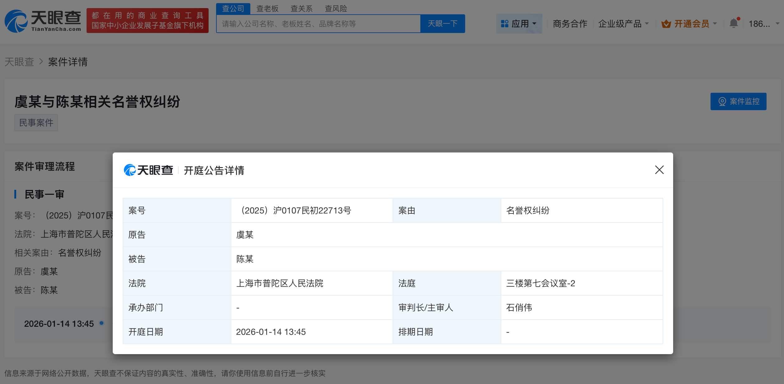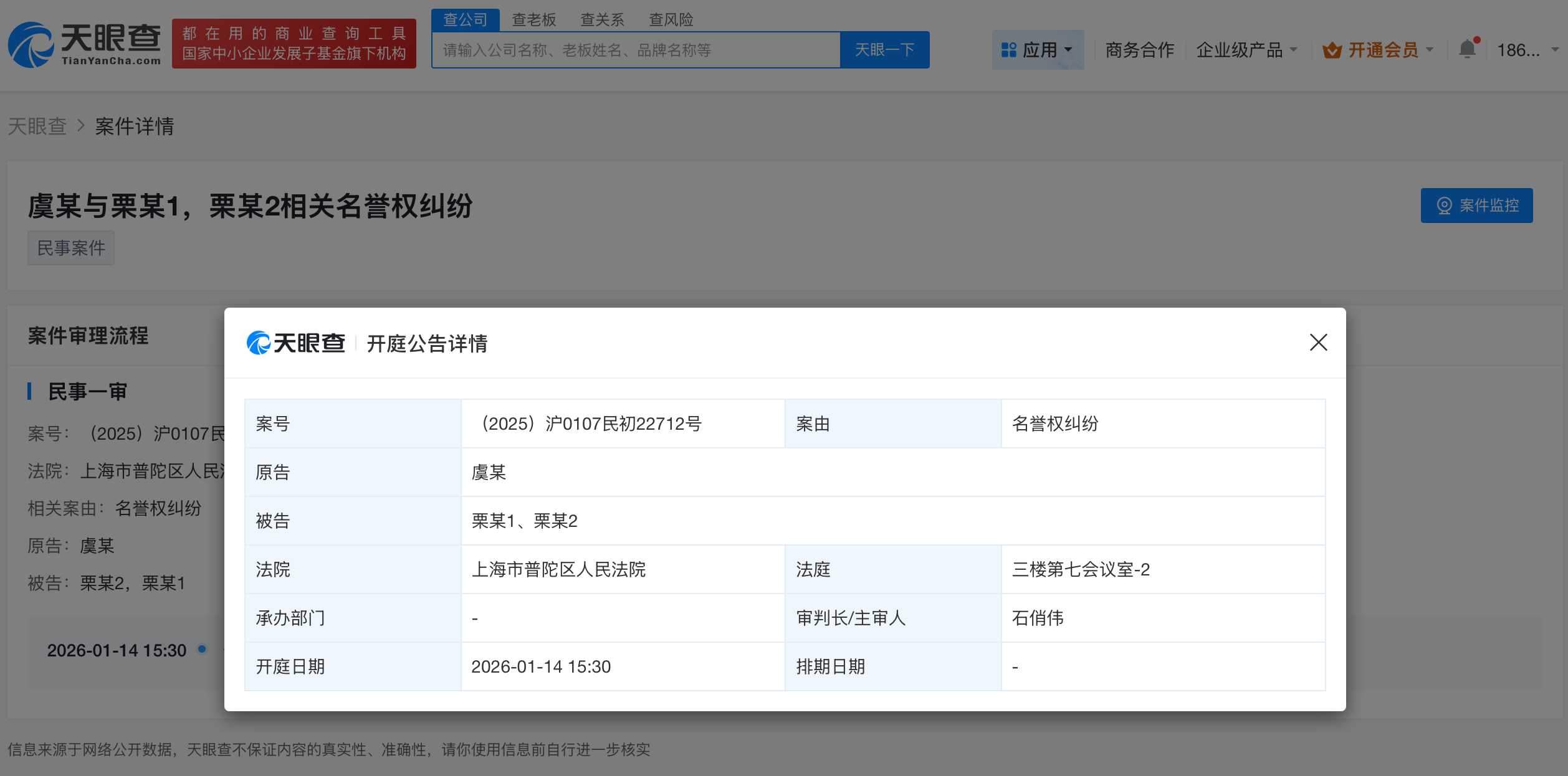 天眼查天眼风险信息显示,近日,虞书欣分别与娄某、陈某、栗某等相关名誉权纠纷案件新增开庭公告,原告均为虞书欣,上述三起案件将于2026年1月14日在上海市普陀区人民法院开庭审理。
