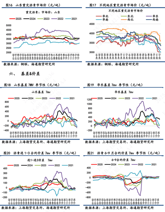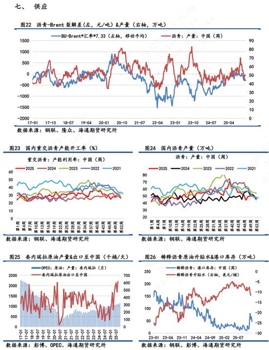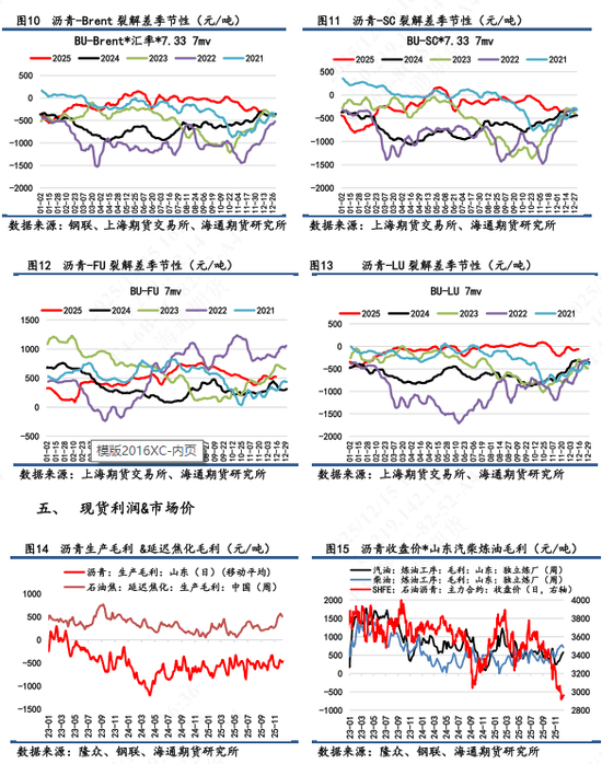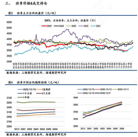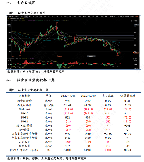 日报观点 【1】盘面表现:BU 2602合约日内上涨到高位后震荡回落,最终收盘2963,涨幅0.03%,盘中最高触及2989,最低2931,近7天累计+0.4%,处于低位震荡。次月合约2603涨幅0.07%,合约期限仍呈现近低远高的Contango结构。 【2】现货市场:①山东重交沥青市场价为2920元/吨,环比回落0.3%,7天累计-0.7%。山东基差为-43元/吨,7天累计-31元/吨。②华东重交沥青市场价为3150元/吨,环比+0%。华东基差为187元/吨,7天累计-41元/吨。 【3】裂解变化:①BU-Brent录得-214元/吨,7天累计-25元/吨。当日BU主力+0.03%;Brent+0.8%(以下午3点收盘成交价计算)。目前油价面临较多不确定性因素,沥青层面作为油价的对冲难度要大一些,裂解差持观望看待。 【4】基本面变化:最新的沥青产销周度数据表现一般,稀释沥青贴水虽有收窄,但贴水幅度仍旧有12美元/桶水平。市场冬储行情释放高价货源争夺平淡,市场倾向于低价货源竞争采购。现货市场跌破3000元/吨,市场对冬储价格产生看跌心理或观望心理。后期还是依旧持续关注冬储行情变化。据百川盈孚数据预测,今年冬储价格有可能会下跌至近五年较低水平,预期在3000元/吨行情来回震荡。本周暂且关注地美国对委内瑞拉的打击力度;俄乌谈判的变局;美联储对明年的降息考虑等因素对油价造成的扰动,进而影响沥青跟随成本端走势。 【5】短期展望:基本面上,价格依旧弱势看待,自身上行空间仍受制于需求减弱和库存压力两方面影响,关注冬储行情是否起色。年底前OPEC+增产冲击油价重心,沥青大概率跟跌重心下移。技术面上,沥青价格持续在磨底震荡,预期仍以低位徘徊为主,仍需耐心等待价格企稳信号。 【6】策略:单边弱势震荡
