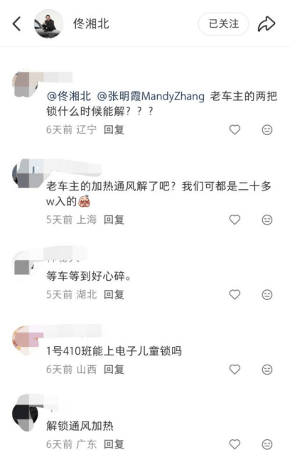 二是配置。有smart精灵1首批车主表示,在购车时车辆具备座椅通风和方向盘加热的硬件功能,但需要付费近3000元开通才能使用。而在一些新款车型上,这两个功能已经免费,这再次让他们感觉到“背刺”。在smart品牌全球公司CEO佟湘北的社交媒体账号上看到,一些老车主也纷纷前去留言,要求把这两个功能免费解锁。