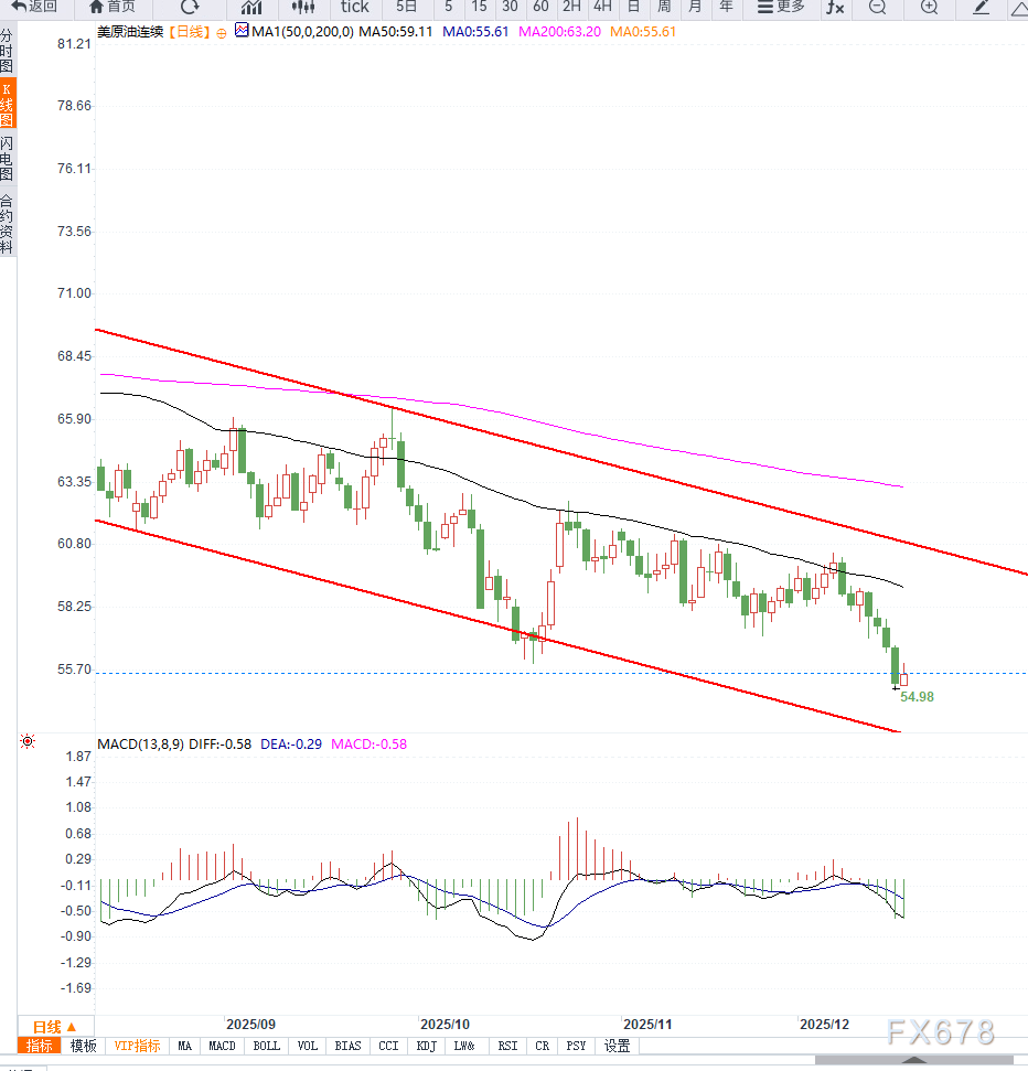 WTI近月合约运行在55.60美元/桶附近,价格已有效跌破前期整理区间,若进一步下行短期支撑位54.50美元,一旦失守,或指向52美元区域;上方阻力位56.50–57.00美元,需明显基本面利多才能修复;