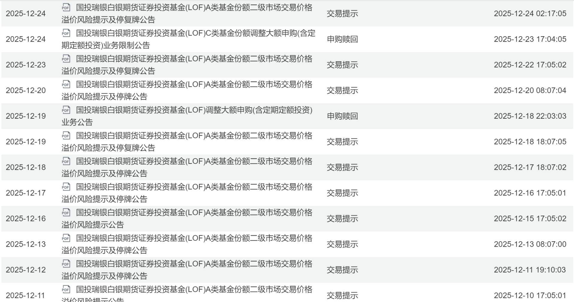 12月24日,国投瑞银白银LOF(161226)早盘临时停牌一小时,复牌即涨停,再次刷新场内价格高度。近期,该LOF成为投资人参与白银期货投资的稀缺性工具产品之一,基金公司多次发布溢价风险提示。 《每日经济新闻》记者注意到,已经有投资人收到券商关于该LOF异常交易的提示,提醒投资人重视二级市场交易价格溢价风险。 有业内人士透露,此类提示一般由交易所发函券商提供重点监控账户名单,主要涉及交易异常行为,券商会先行向客户进行投教提示以及风险告知,如果仍存在违规交易的行为则会采取进一步的限制措施。 有投资者收到“异常交易”提醒 12月24日,国投瑞银白银LOF早盘临时停牌一小时,复牌即涨停封板,截至午盘休市,盘中涨幅达到9.99%。 据悉,该LOF是近期市场关注度较高的一例场内标的,除了基金公司不断提示溢价风险之外,监管和券商也在对该产品“异常交易”进行监控。