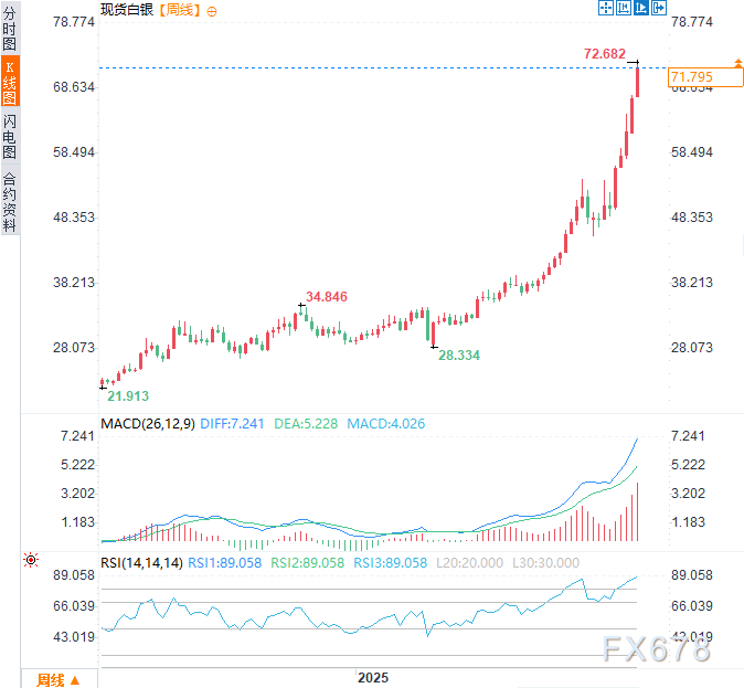 白银正以全然不同的姿态迈入2026年。在2025年末突破55美元/盎司并牢牢守住50-54美元区域形成坚实基底后,这种金属已从“被遗忘的资产”蜕变为大宗商品领域最具爆发力的传奇之一,周三(12月24日)一度刷新历史高点至72.68美元/盎司,年内近150%的涨幅说明了一切。白银不仅跑赢了黄金——更用强势表现改写了近十年疲软的叙事逻辑下图所示的价格动作通常只意味着一件事:市场终于承认供需失衡是结构性的,且正在不断加剧。