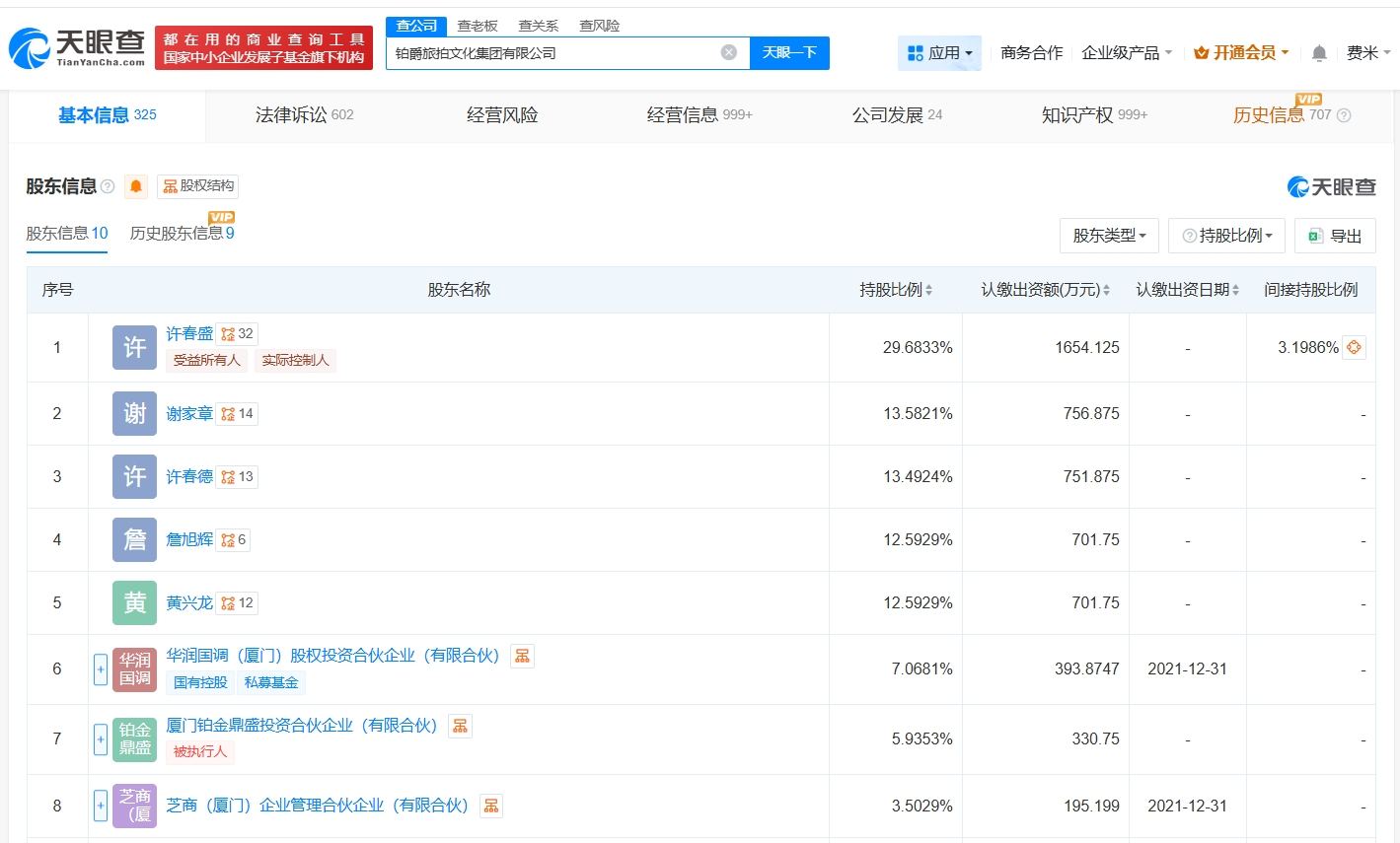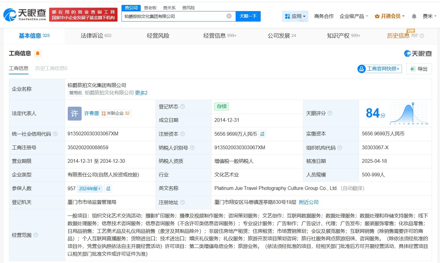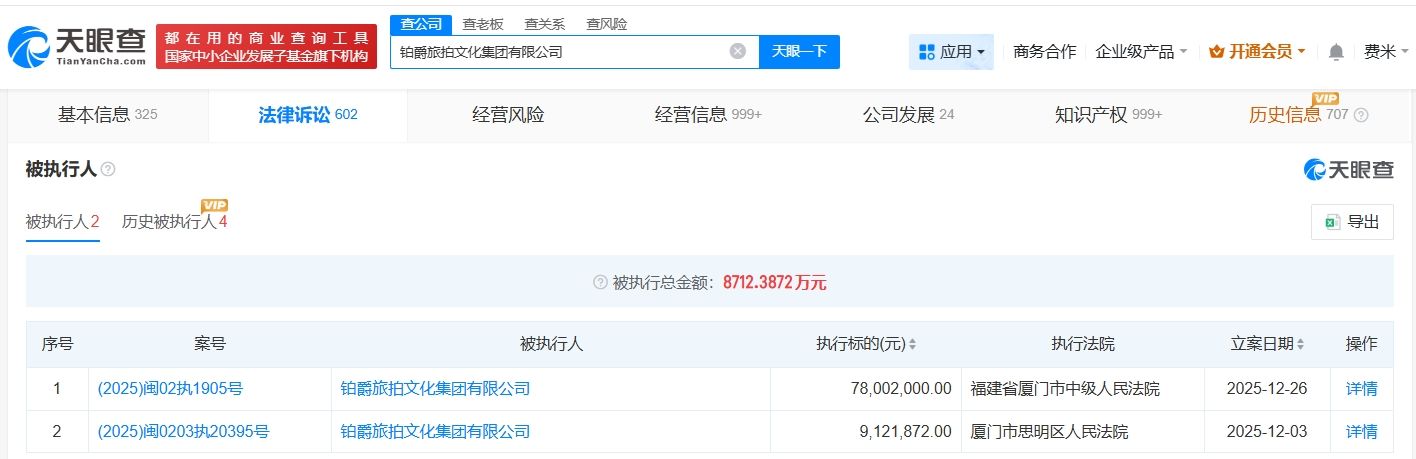 天眼查法律诉讼信息显示,近日,铂爵旅拍文化集团有限公司、许春盛等新增一则被执行人信息,执行标的7800.2万人民币,执行法院为福建省厦门市中级人民法院。