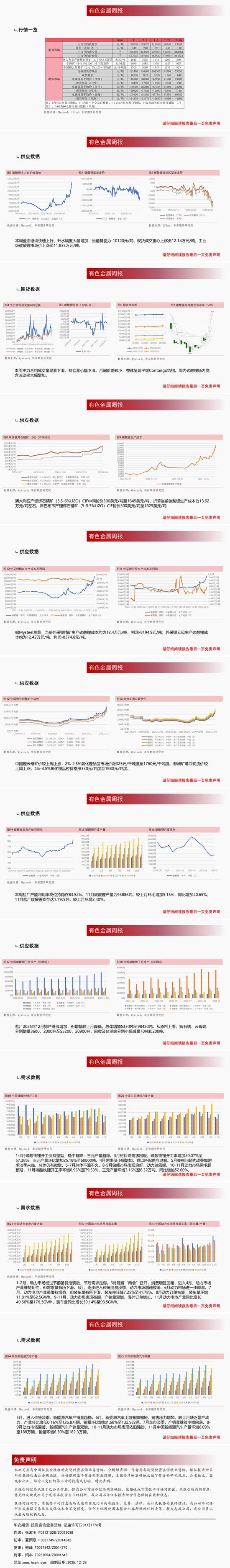 摘要: 矿端:本周矿价因期价上行显著上涨。持货商为头寸管理及风险评估等目的向贸易商询价动作较多,贸易商多结合盘面套保利润倒推报价。盐厂备货充足,且对高价接受度偏低,市场整体成交清淡。 上游:上游产能利用率高位持稳,供应端总体生产稳定,预计12月环比仍有小幅增量。碳酸锂产业库存持续去化,去化速度边际放缓。SMM数据显示,碳酸锂周度库存达109773吨,较上周减少652吨。其中,冶炼厂环节17851吨(-239吨),下游环节39892吨(-1593吨),其他环节52030吨(+1180吨)。 下游:终端需求韧性较强,动力订单开始减少,储能景气度仍高;材料端已有减产意图,部分铁锂材料厂出现减产检修动作,三元企业主动控制库存。三元企业与下游的下年长单谈判仍未有明确结果,主因钴、锂等原料价格走势不明朗,且下游电芯厂态度较强。本周磷酸铁锂市场价大幅上调,三元价仍在高位。 现货:本周现货价格大幅上涨,主要受期货的影响。下游采购以长协及客供为主,按生产计划调整;部分企业因刚需被迫采购高价货源。 交易:本周主力合约成交量显著下滑,持仓量小幅下滑。盘面继续快速上行,升水幅度大幅增加。 市场信息: 1、24日夜,广期所发布通知限制碳酸锂部分合约最小开仓下单数量、交易限额。 2、25日,天齐锂业(002466)发布公告,将现货交易结算价参考由SMM价格改为Mysteel价格或广期所主力合约价格。 3、26日,国家发展改革委发文《大力推动传统产业优化提升》,其中提到“对新能源汽车、锂电池、光伏等‘新三样’产业,关键在于规范秩序、创新引领。”再次强调“反内卷”主题。 4、26日,SMM发布澄清公告,表示其现货价格“属于市场定价机制下的正常现象”,声明“不参与任何期货市场交易操作,坚决维护市场秩序”,并对近期市场上出现的某些虚假信息表示强烈谴责。 5、25至26日,湖南裕能、万润新能、德方纳米(300769)、安达科技四家磷酸铁锂企业相继披露检修减产计划时间均集中在2026年1月,为期一个月。 市场信息解读: ? 广期所再度管控盘面风险,意在对当前过热情绪进行政策降温。 ? 天齐锂业更改结算价参考标准,旨在使报价更贴近盘面;下游磷酸铁锂龙头企业相继检修减产,意在抵触高价并向下游传导成本。侧面反映上下游博弈激烈。 ? 国家发改委发文再次强调“反内卷”主题,提振市场信心,相关品种日内显著上涨。 ? SMM公告,一方面澄清市场不实消息,另一方面提及广期所管控措施,呼吁市场理性。 核心观点: 本周盘面继续快速上行,市场信息较多,博弈加剧,情绪高涨。基本面释放边际转弱信号,去库速度继续放缓,周度去库量缩小至1000吨以下。现货散单高位难以成交,盘面处于高位压力测试期。 下周关注: ? 关注1月下游排产是否如期减量,或对锂价造成实际利空。 ? 库存去化速度已放缓至低位,谨防库存拐点来临。 ? 当前上下游博弈加剧,各方信息出尽后,观测锚点或回归现货成交。 ? 枧下窝复产问题仍需中期跟踪。 ? 中长期需关注电芯厂及终端会否承接材料端的成本传导。明年Q1终端实际需求若维持韧性,则有利于传导,或支持锂价中枢上移;否则情绪降温后锂价随基本面回落可能性更大。