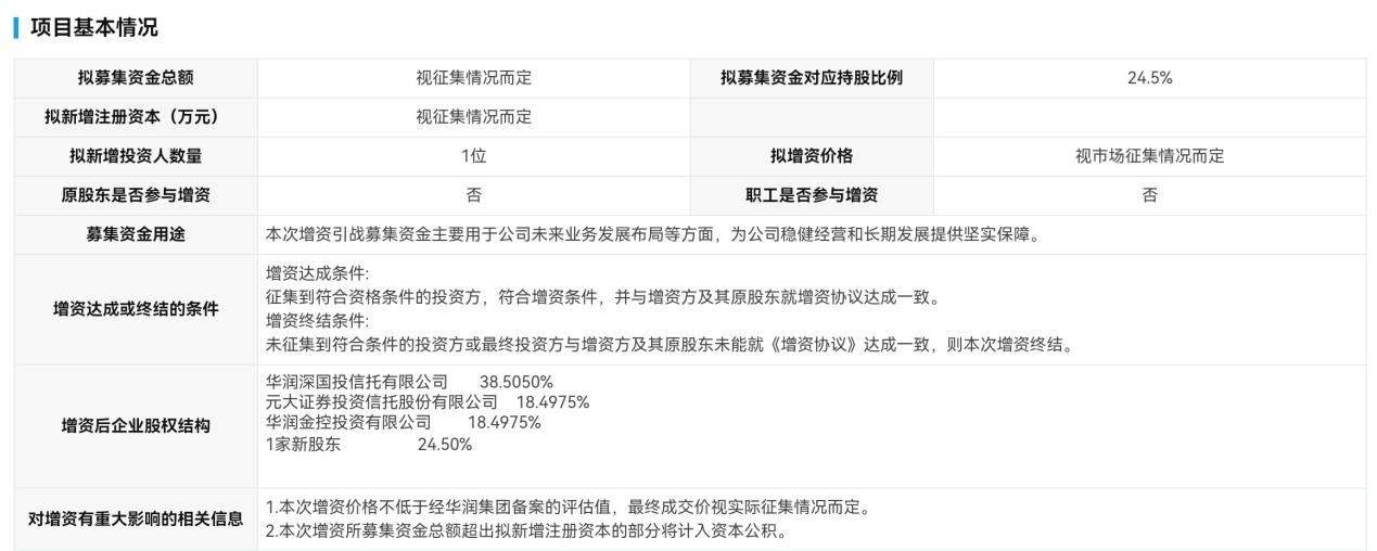 值得注意的是,这部分股权并不是第一次挂牌转让,早在2021年和2022年,就曾以3700万元的底价多次挂牌转让。 从挂牌底价来看,此次4118.96万元的价格相比于前几年的3700万元,加价了约11%。 财务数据显示,2024年长安基金营收约1.7亿元,净利润2521.45万元,此外,截至2025年11月30日,长安基金营收约1.3亿元,净利润4022.1万元。 回看2021年时,长安基金的财务数据显示,营收约3.55亿元,净利润为5917.85万元。 可以看出,相比于2021年,长安基金这几年的营收已经大幅下滑,2025年11月30日净利润虽较2024年有所回升,但仍低于2021年水平。 华润元大基金拟增资引入新股东 与长安基金股东方寻求转让股权不同,华润元大基金计划增资引入新的投资方,此次的增资项目于近期在上海联合产权交易所公开披露。 披露的信息显示,此次募集资金对应的持股比例达24.5%,增资价格不低于经华润集团备案的评估值,最终成交价视实际征集情况而定。 虽然拟募集金额视征集情况而定,但如果增资成功,这家投资方将成为华润元大基金的第二大股东。