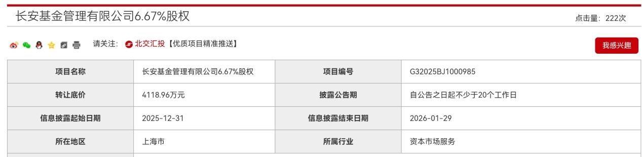 公开资料显示,长安基金目前共有5位股东,此次挂牌转让的股权来自于兵器装备集团财务有限责任公司,其持有长安基金6.67%股权,位列第五位。