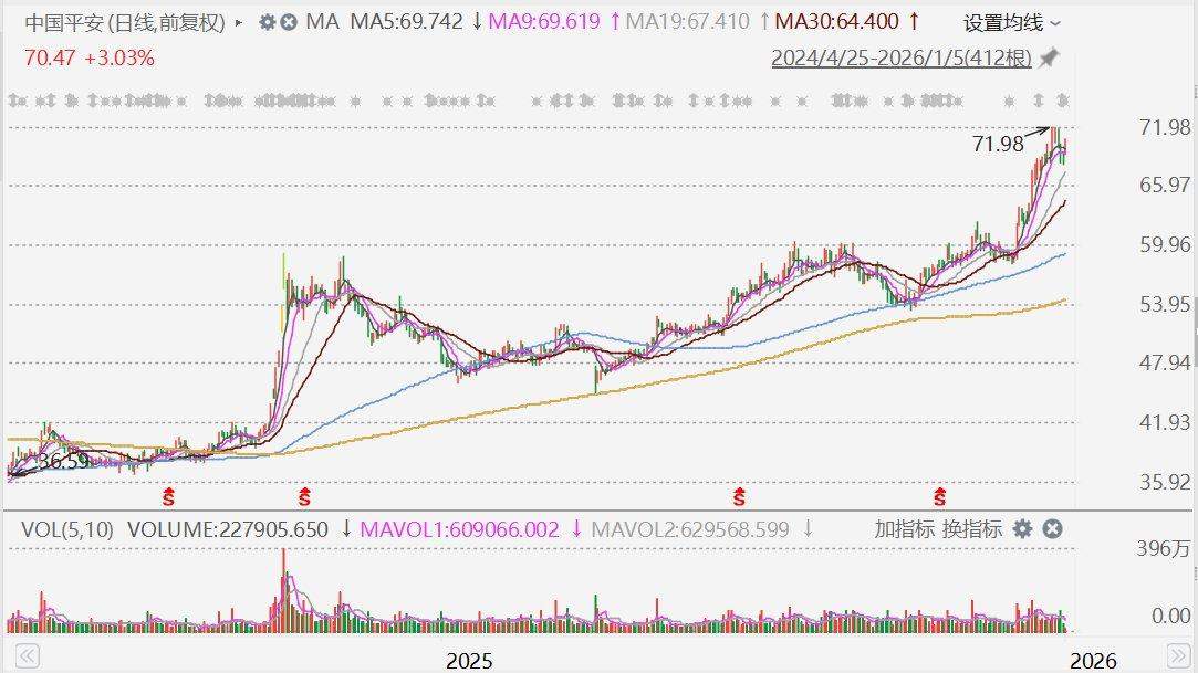 富拓外汇平台:2026年开局表现亮眼!中国平安涨超3%重上70关口,2025年公司股价累计涨幅35.87%,为连续第二年上涨