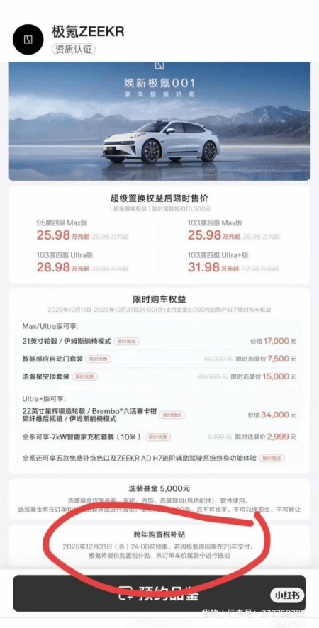 文|《次世代车研所》栏目 罗宁 根据相关政策,自2026年1月1日起,新能源汽车购置税政策迎来重大调整,从全免变为减半征收(按5%税率)。 在去年下半年,极氪就上线了一个“跨年购置税补贴”,称只要在2025年12月31日24点前锁单,如因极氪原因导致车辆在2026年开票交付,极氪也将提供购置税补贴,并在订单车辆尾款中予以抵扣。 这一承诺令不少车主吃下“定心丸”,纷纷在政策窗口期下单购车。然而,当时间来到2026年,极氪却“食言”了。多位车主向《次世代车研所》栏目反映,称自己已经在规定期限内锁单交定金,但跨年后极氪官方却表示“无法直接兜底购置税,仅能以积分进行补偿”。 这样的车主来自全国各地,有数百人之多,他们自嘲是“极氪的韭菜”。对于上述情况,极氪官方暂无最新回应。 在行业专家看来,极氪食言的原因可能是生产出了问题,如今面临大量用户投诉,极氪需要面对承受经济损失或者失约的两难抉择,但无论结果如何,本次事件会对其品牌造成不利影响。 政策退坡:兜底承诺成“空头支票” 对于车主而言,购置税政策的调整,意味着购车成本直接增加约车价的5%,以极氪旗下主力车型20万元以上的定价计算,车主需多支付1万元左右的购置税,这一金额对于不少购车家庭而言并非小数目。