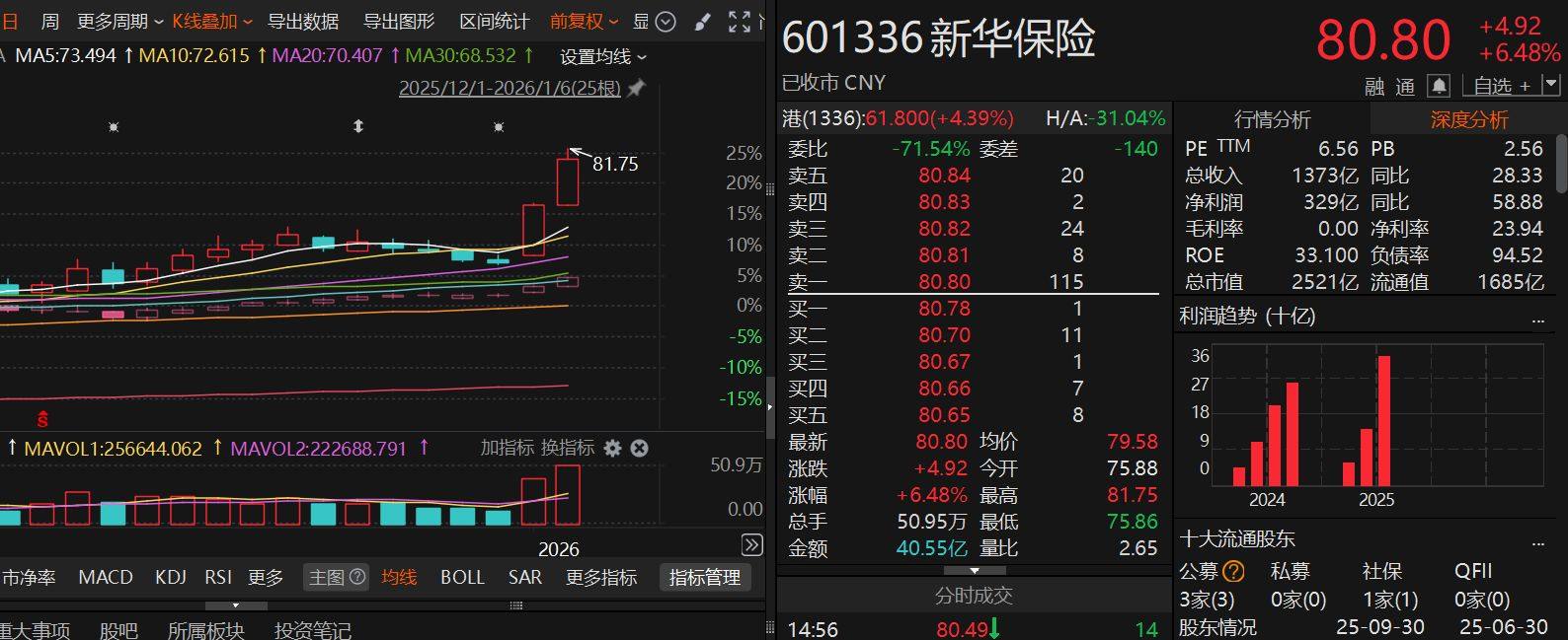 图片来自:网络 看资金动向:保险起飞,沪指“上保险”? 沪指4000点在A股投资者心理上具有重要地位。自从2024年“924”行情以来,多空双方已在沪指4000点位置展开多次争夺。而在这一场2026年开年大戏中,保险板块的表现尤为引人关注。1月5日、6日,A股保险板块连续两个交易日大涨,中国平安、新华保险、中国太保均创出历史新高。 A股历史上,如果说券商板块经常充当牛市的急先锋、风向标;那么保险板块经常充当厚积薄发的压舱石。2026年,有保险板块坐镇,沪指4000点,稳了? 以下是中国平安、新华保险、中国太保的日K线图。