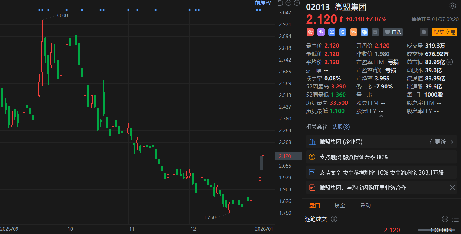 微盟集团(2013.HK)大幅高开7%,报2.12港元,总市值83.95亿港元。消息上,微盟集团昨日盘后公告,集团正式宣布与阿里巴巴集团旗下本地生活服务平台淘宝闪购展开业务合作,本集团旗下上海微盟企业发展有限公司与淘宝闪购平台主体上海拉扎斯信息科技有限公司于近期签订战略合作协议,将在双方共通行业开展多维业务合作与探索,包括但不限于:解决方案商家互联,即时零售生态共建;公私联营、会员打通,一站式营销升级;及创新共创,在企业级客户拓展、AI、数据运营等场景探索共建。  |