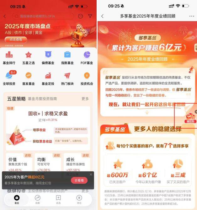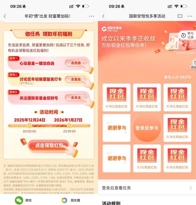 来源:招商银行手机APP 根据介绍,领取福利需要完成三个任务,才有机会领取现金红包。任务包括将心动基金一键加自选、讨论区年初展望留言打卡、关注国联安基金招财号。红包金额并不算大,但参与人次已经多达26277人。 1月8日,有业内人士在同记者交流时表示,类似的方案是合理的,因为是通过任务达成之后间接进行的权益派发,没有直接参与销售基金派发红包等行为。也有人士表示,此类红包并不算大额红包,表示不太关心此类权益的使用。但有观点也认为,实施有奖营销或变相引导投资人购买指定产品,削弱了其选择的自主性。 事实上,针对基金销售机构的业务约束,《公开募集证券投资基金销售机构监督管理办法》已有规定,基金销售机构及其从业人员从事基金销售业务,不得有包含采取抽奖、回扣或者送实物、保险、基金份额等方式销售基金的行为。 那么,平台针对新人客户发放限时福利,比如申购金额满减活动、申购费用上限封顶,类似的营销方案是否与现行规定要求有冲突?再如派发福利及新客券包等形式,是否合规等问题,记者在同天天基金和招商银行相关负责人了解情况时,双方均未做出官方性回复。 行情持续回暖,公募基金年初频频增加销售机构 2026年开年以来,A股连续多个交易日上涨,万得全A新年首日上涨1.99%,创下2015年以来最好年度首日表现。买卖双方机构都对跨年以及春季躁动行情充满期待,基金公司的发行也在加速。 Wind统计显示,新年首周(1月5日至11日),全市场共有45只新基金进入募集期(按认购起始日计),不仅创下近12周以来发行数量新高,较前一周增幅更超过4倍,市场活跃度显著攀升。 此外,还有多家基金公司旗下的产品在近期公告提前结束募集。其中,平安港股通均衡配置、华宝中证全指电力公用事业ETF、广发国证工业软件主题ETF等均在近期提前结束募集。 与此同时,基金公司也频频出现增加销售机构的情形。1月8日,诺安基金新增中信证券、中信期货有限公司等4家机构代销旗下诺安价值增长混合C;英大基金增加开源证券为公司旗下英大安瑞6个月的销售机构。 据不完全统计,截至1月8日午间,已经有21则公告涉及公募基金公司针对旗下产品的代销新增销售机构,其中有不少是主动权益类基金。这些现象是否意味着行情转暖、销售阻力开始减小呢? 1月8日,有公募行业内部人士明确表示——不好卖。 “很多人都不想买基金,所以推进基金的工作很吃力,但是为了筹备资金,像一些派红包的营销方案也会推出,但效果不一定好。除非是一些稳健的客户才会考虑买基金,一般有股票持仓的很少会配置基金产品。” 不过,行情转暖背景下的赚钱效应也在提升,对公募基金的发行提速带来促进。有受访者表示,2025年国内市场整体市场表现不错,投资者赚钱效应较好,新发市场回暖。目前市场普遍对2026年的行情较为乐观,也提升了整体的风险偏好。监管出台的多项政策推动公募行业高质量发展,提升了投资者对公募基金的信心和信任。 |
