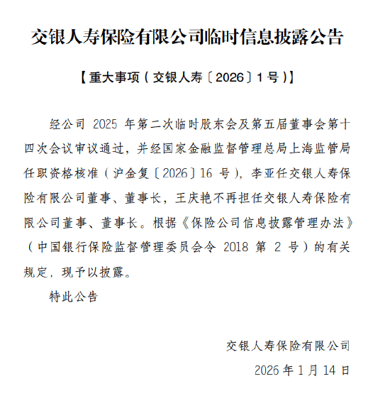 1月14日金融一线消息,交银人寿发布公告称,经公司2025年第二次临时股东会及第五届董事会第十四次会议审议通过,并经国家金融监督管理总局上海监管局任职资格核准(沪金复〔2026〕16 号),李亚任交银人寿保险有限公司董事、董事长,王庆艳不再担任交银人寿保险有限公司董事、董事长。