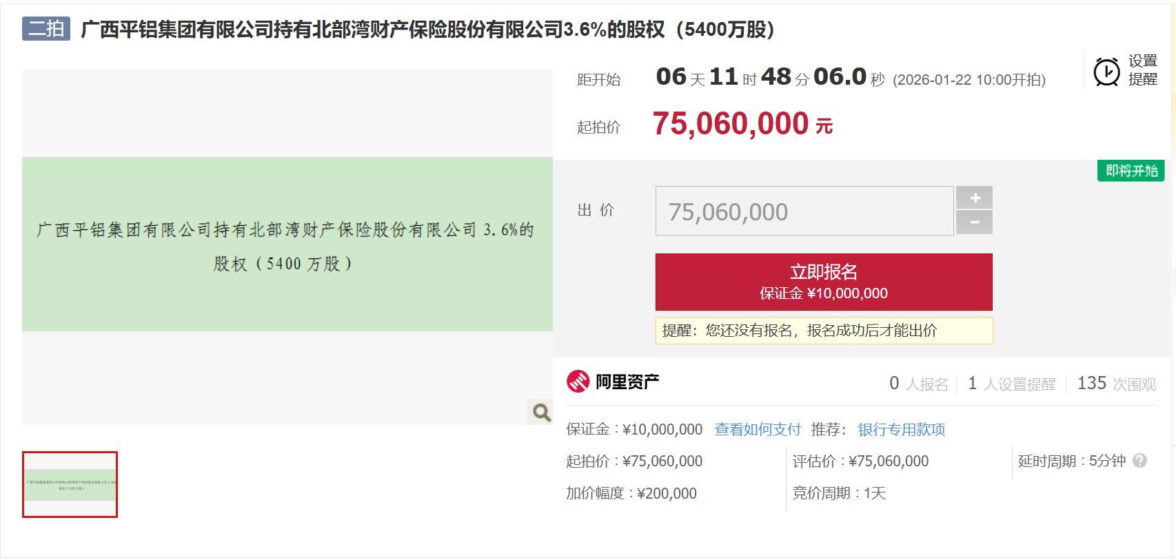 北部湾财产保险股份有限公司(以下简称北部湾财险)的两笔股权即将被二次拍卖。 日前,《每日经济新闻》记者从阿里拍卖平台获悉,广西平铝集团有限公司(以下简称广西平铝集团)持有的北部湾财险6%股权将于1月22日拍卖,拍卖分为两笔,合计起拍价1.25亿元,开拍时间为1月22日。 据了解,股权拍卖的权利来源为司法裁定,对应案号(2025)桂01执2523号。天眼查显示,该案号背后涉及的执行标的为3.55亿元,广西平铝集团为被执行人之一,所持股权因此被法院列为执行标的。去年年底广西壮族自治区南宁市中级人民法院就曾对该股权进行拍卖,但以流拍告终。