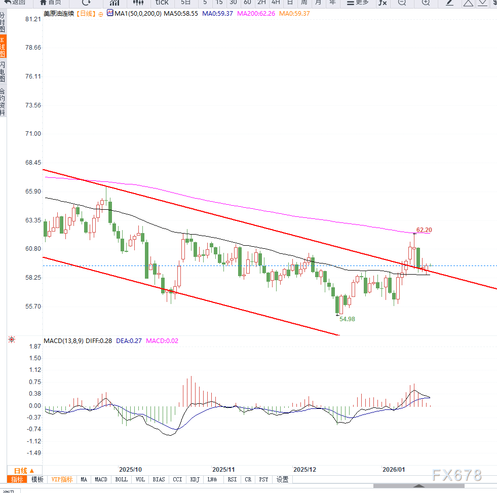 反之,一旦再度跌破58美元,可能重新指向56.80美元支撑。整体判断,日线级别仍属于震荡筑底结构,在缺乏重大地缘或需求利好之前,价格更可能以区间整理为主。
