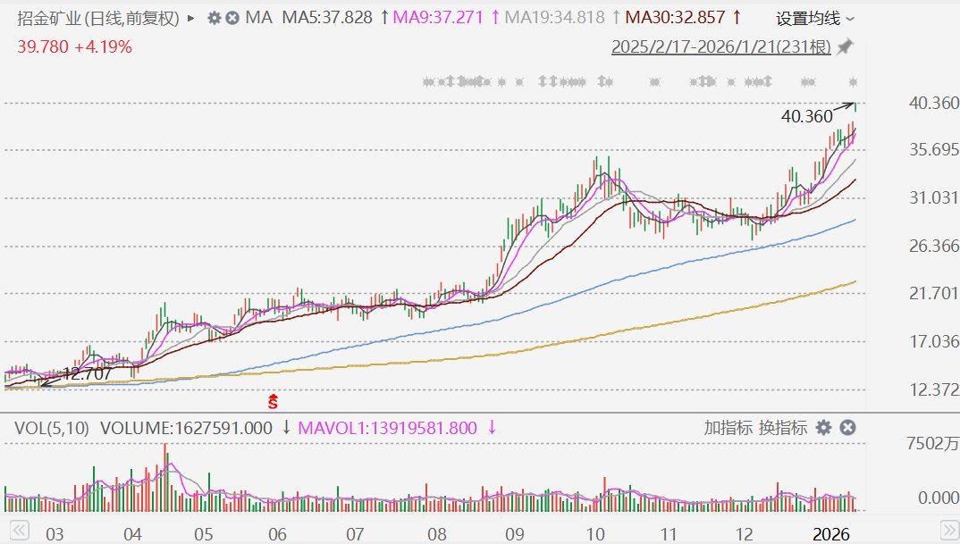 国际金银价格不断创出历史新高,港股市场相关概念股集体走强,其中,招金矿业(1818.HK)一度大涨近6%至40.36港元,创历史新高价,市值超1400亿港元。