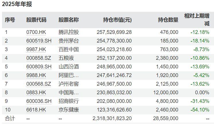 再看易方达优质精选,在前十大重仓中,腾讯控股、阿里巴巴-W、分众传媒等个股的持股数减少,持仓同样下降的还有贵州茅台、五粮液、山西汾酒、泸州老窖。值得一提的是,携程集团-S的持仓数量保持不变。