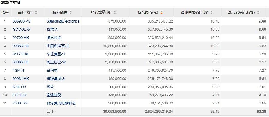 最后来看易方达亚洲精选,前十大重仓股中最大的变化是富途控股新进前十大,普拉达退出前十大。另外,三星、谷歌、台积电这些科技股的持仓数量也有所减少。