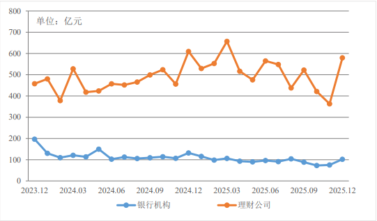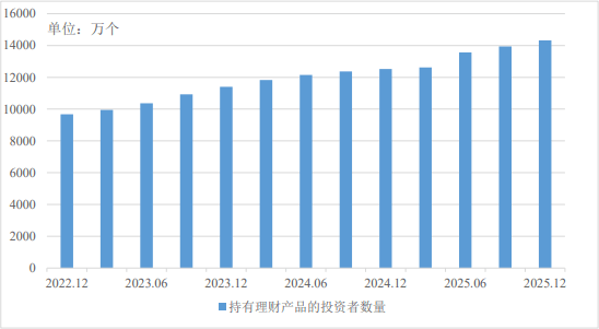(理财产品资产配置情况,资料来源:银行业理财登记托管中心) 值得关注的是,理财产品对公募基金的配置力度增强,2025年末投向公募基金的资产占比为5.1%,较上一年提升2.2个百分点。 国信证券分析指出,这一趋势源于两大刚需:一方面体现在稳定净值,即通过配置债券基金、中性策略基金等,平滑理财组合波动。另一方面体现在增厚收益,即借助公募基金的权益投研优势,以FOF/MOM 等形式间接参与股市,弥补自身短板。 光大证券分析认为,未来理财公司进一步拓展含权产品确定性较强。如果2026年理财规模增量3万亿左右,资本市场延续慢牛走势,以2025年配置结构静态测算,银行理财有望带来1500-3000亿股票类资产配置资金。 1800万投资者跑步入场, 全国银行理财产品投资者数量达1.43亿 2025年,理财投资者数量维持增长态势。截至2025年末,持有理财产品的投资者数量达1.43亿个,较年初增长14.37%。其中,个人投资者数量较年初新增1769万个,机构投资者数量较年初新增31万个。